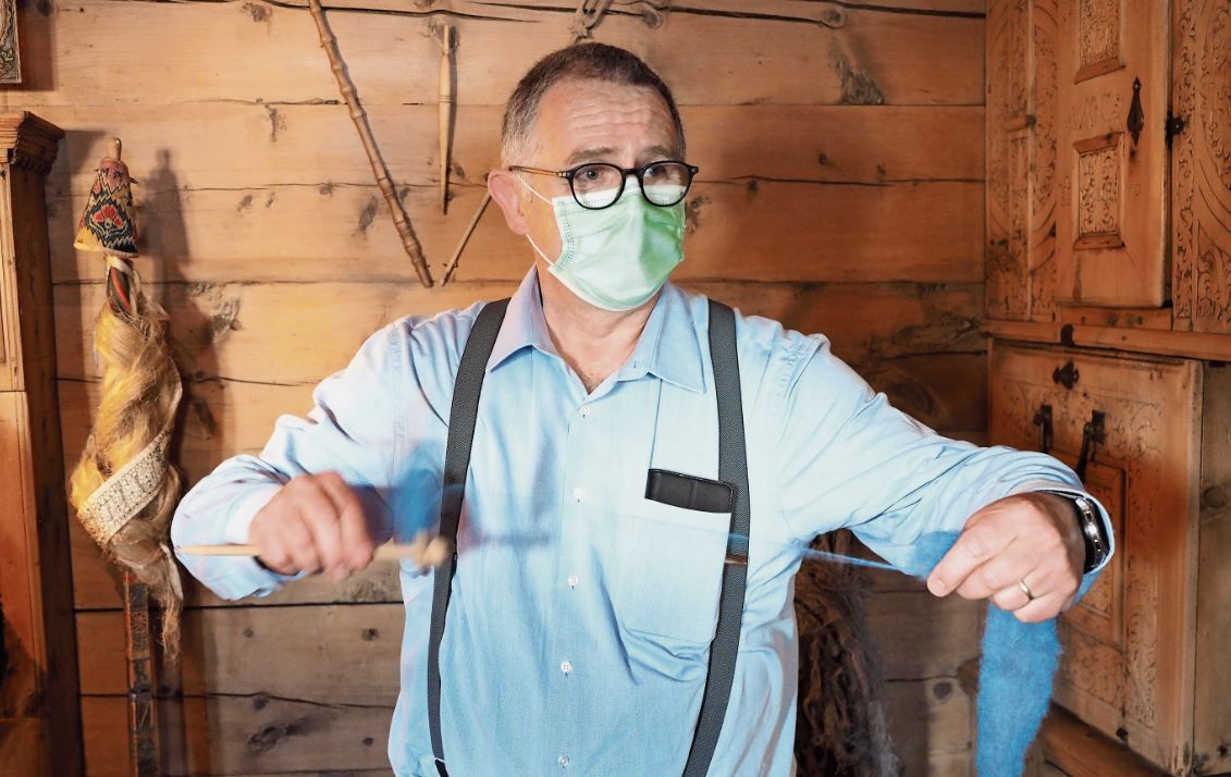 Jachen Gaudenz spinnt mit der Maya Handspindel. Damit lässt sich gar im Zug ein Wollfaden herstellen.