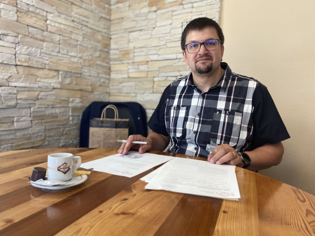 Linard Martinelli, promotur regiunal da la Lia Rumantscha, dürant il Cafè Rumantsch a Scuol (fotografia: Nicolo Bass).