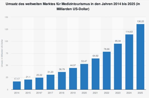 Umsatz des weltweiten Marktes für Medizintourismus in den Jahren 2014 bis 2025, prognostizierte Werte in Milliarden US-Dollar, veröffentlicht von Rainer Radke, 11.12.2018, Statista 2020.