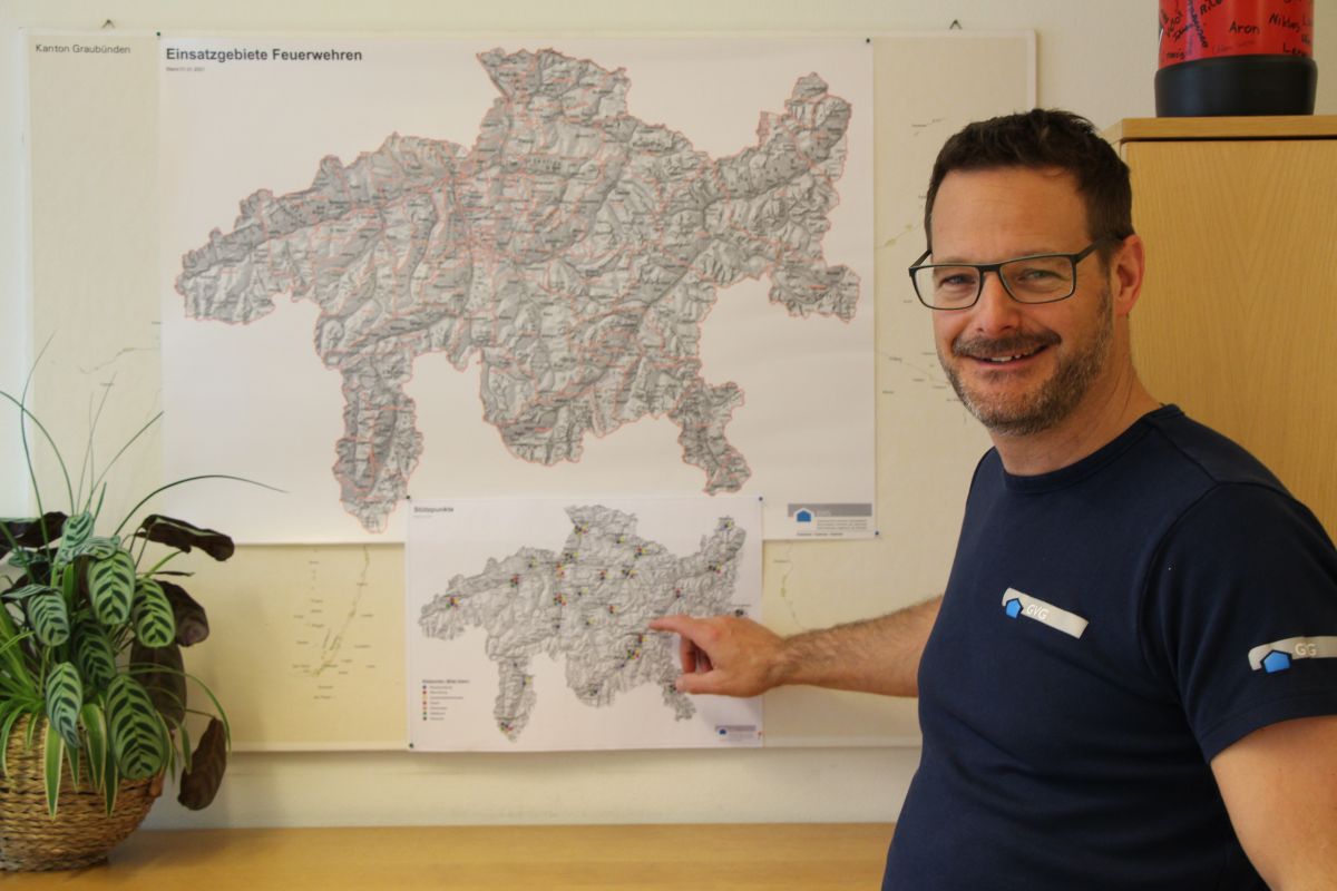 Conradin Caduff erklärt das Feuerwehrstützkonzept. Grüne Punkte zeigen Stützpunkte auf, an denen Material zur Löschung von Waldbränden gelagert ist. Dieses kann von den Stützpunkten zur Einsatzstelle geflogen werden.