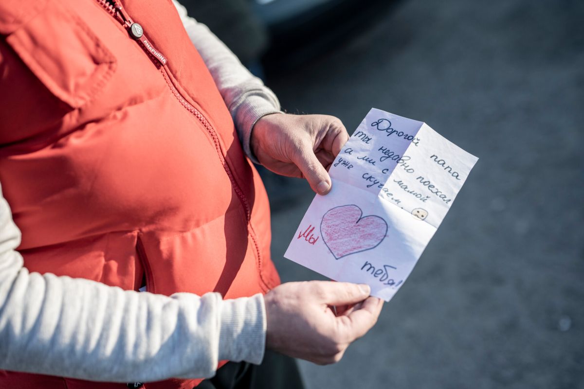 Oleksander Hrebinnyk mit der letzten Botschaft seiner Tochter (Foto: Mayk Wendt
