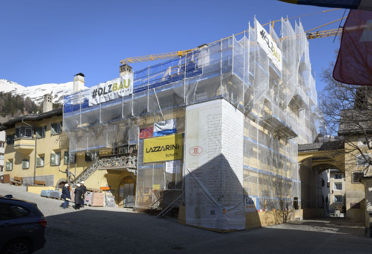 Die Chesa Planta am Dorfplatz von Zuoz ist nicht wiederzuerkennen. Der untere Hausteil ist gänzlich eingerüstet und eingehüllt, längs der Südfassade türmen sich Backsteinpaletten und Gerüststangen, auch im ...