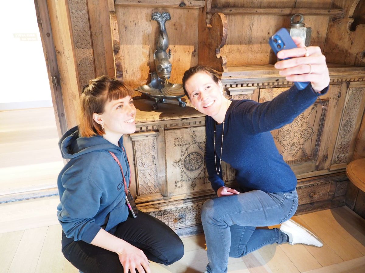 Dieses Duo hat sein Lieblingsobjekt im Engadiner Museum gefunden: Einen Wasserspender in Form eines Fabelwesens, der sie zu einer Geschichte inspiriert.
