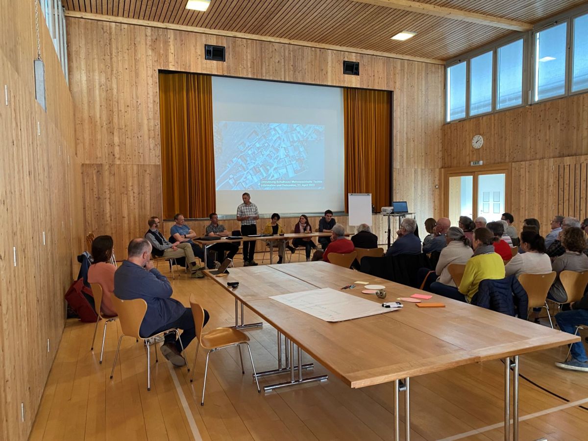La populaziun da Tschlin ha pudü definir giavüschs per l’adöver futur da la chasa da scoula e da la sala polivalenta a Tschlin (fotografia: Andri Netzer).