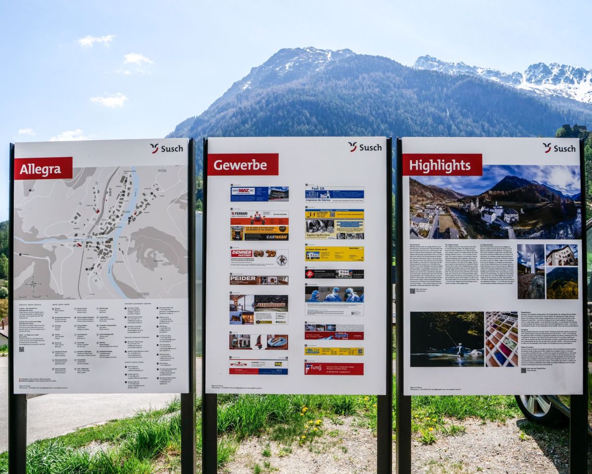 Las tablas d’infuormaziun a Susch infuorman ils giasts in lingua tudais-cha, francesa ed inglaisa (fotografia: Nicolo Bass).