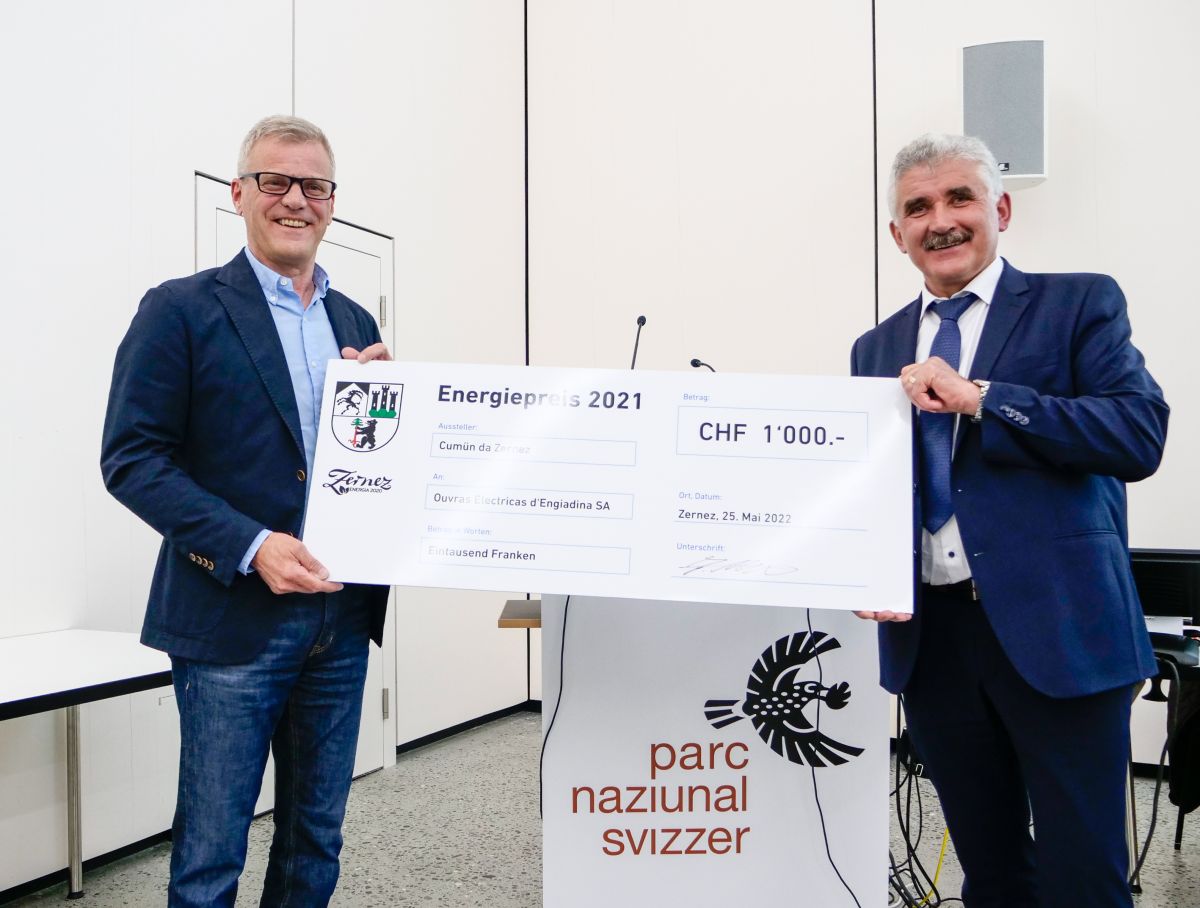 Heinz Gross, manader progets e logistica da l'OEE SA (a schnestra) survain dal president cumünal da Zernez scadent, Emil Müller, il schec dal premi d'energia 2021. fotografia: Jon Duschletta