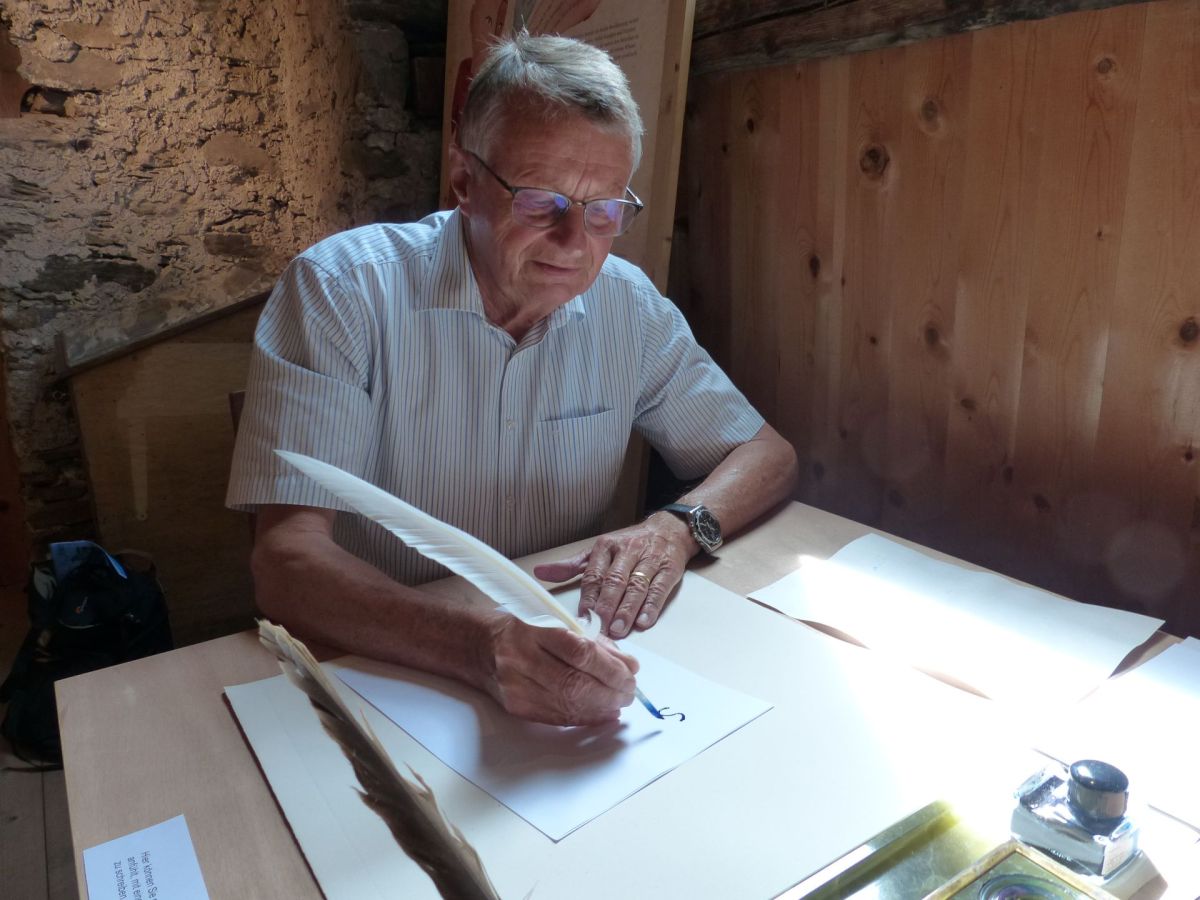 Theodor Gut, chi’d es commember dal cussagl da fundaziun dal museum Stamparia Strada, scriva culla penna d’ocha (fotografia: Flurin Andry).