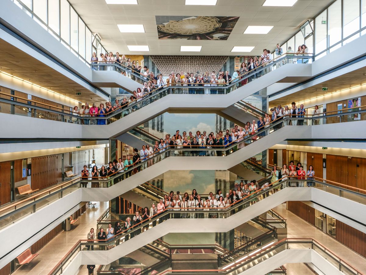 160 Präsidentinnen versammeln sich rund um Bundesrätin Sommaruga im Treppenhaus des Gymnaisums Neufeld in Bern. Foto: Jon Duschletta