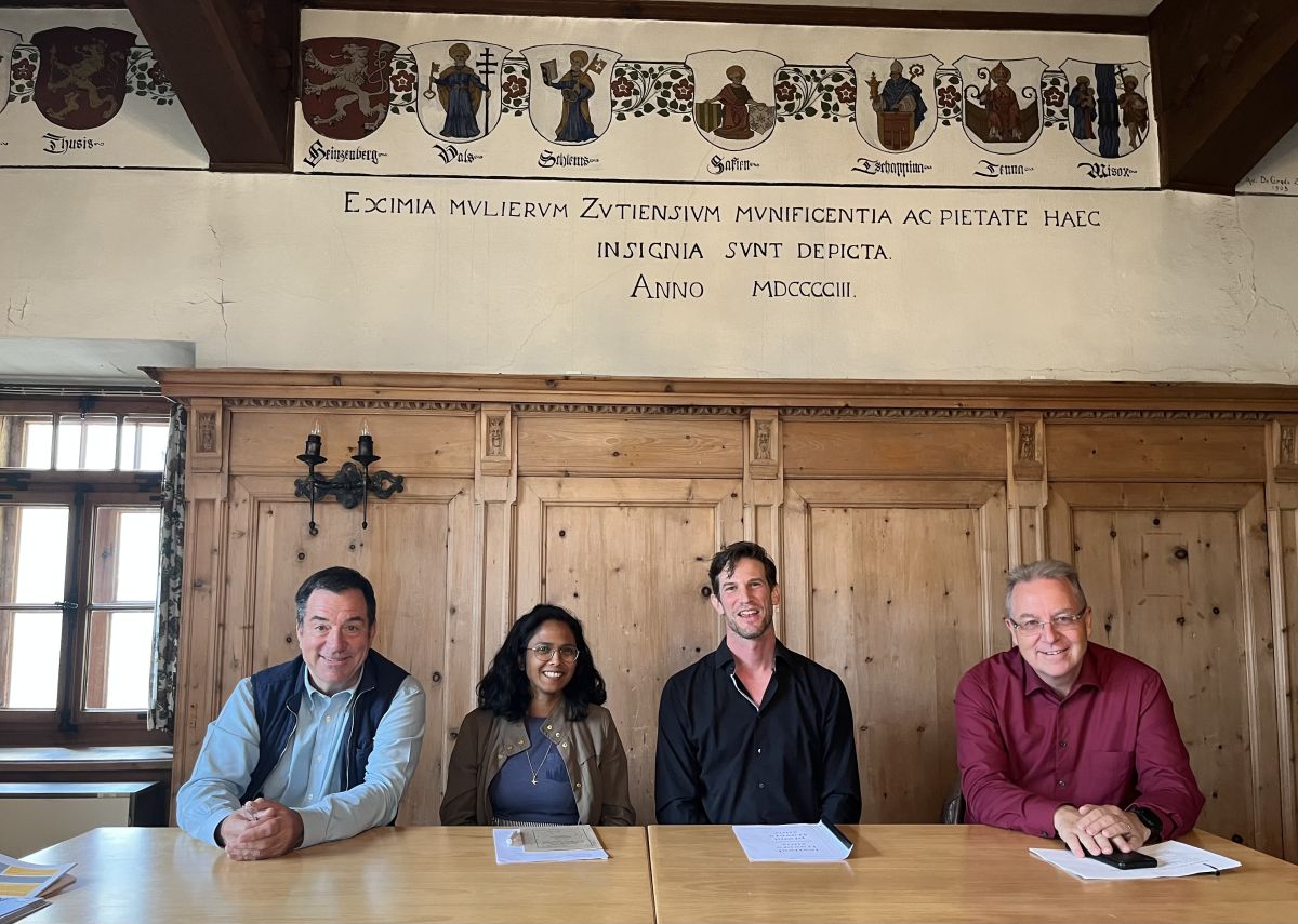 Andrea Gilli (da schnestra), Gianna Olinda Cadonau, Ivo Bärtsch e Lucian Schucan haun oriento davart il «festival travers zuoz» (fotografia: Martin Camichel).