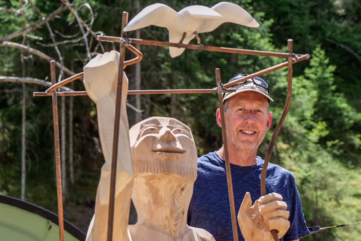 David Rohrbach da La Punt Chamues-ch cun sia sculptura «Unter 4 Augen». fotografia: Jon Duschletta
