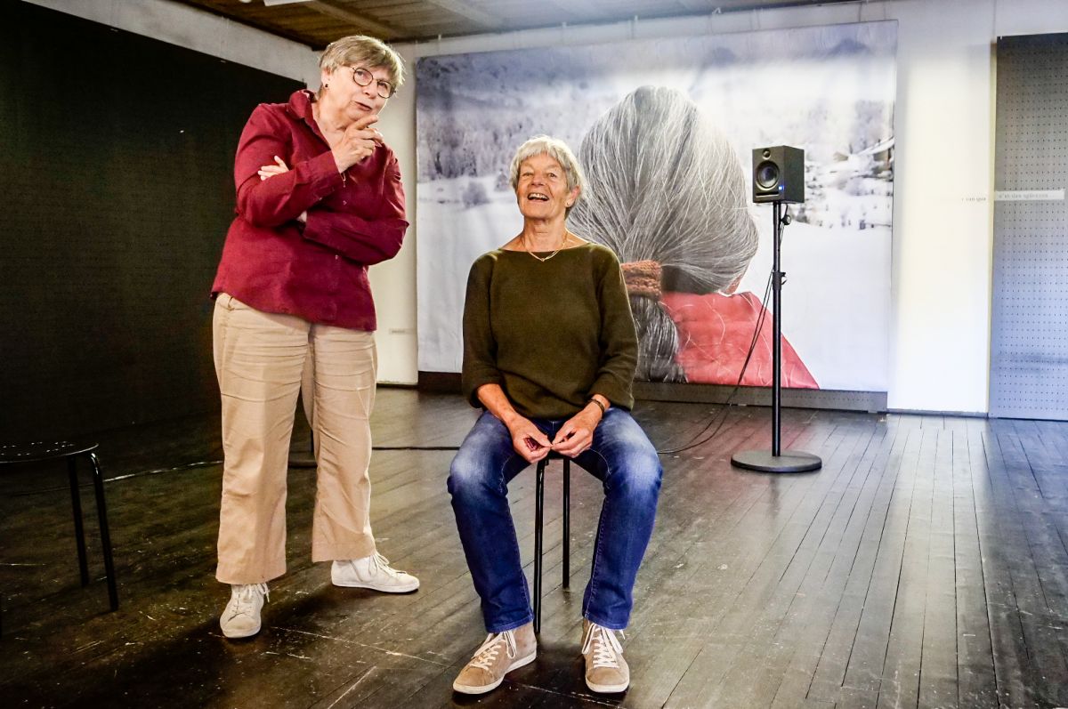 Monika Drach (a schnestra) e Gianna Vital-Janett immez l’installaziun audio-?fila i’l Kunstraum Riss a Samedan.