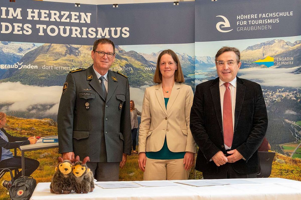 Brigadier Marcel Amstutz, HFT-Schulleiterin Judith Meilwes und der Vorsitzende der Geschäftsleitung der Academia Engiadina, Sigi Asprion (von links) nach der Vertragsunterzeichnung. Foto: Reto Stifel