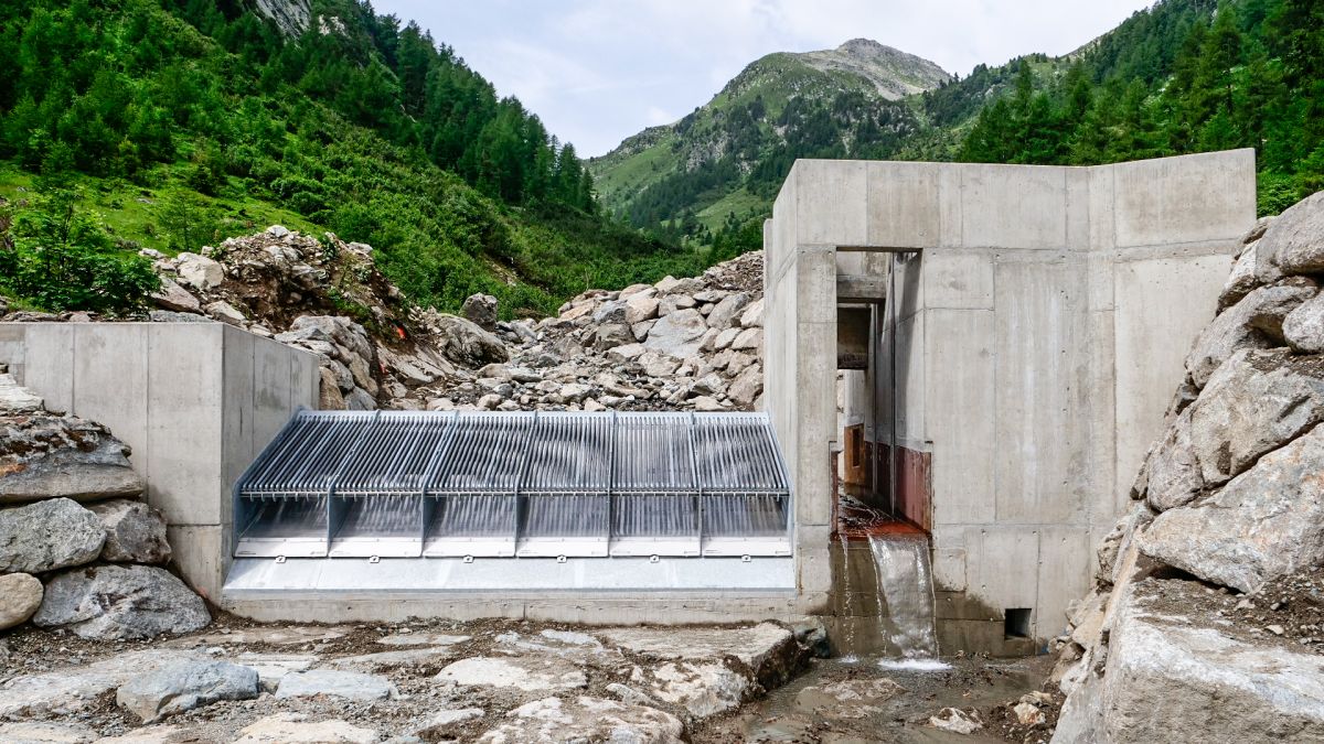 Vista sül inchaschamaint da l’Ova da Sarsura, la serra cul uschè nomnà Tiroler-Wehr ed il Coandarechen ed ün portal per sviar l’aua in cas da neccessità. fotografia: Jon Duschletta