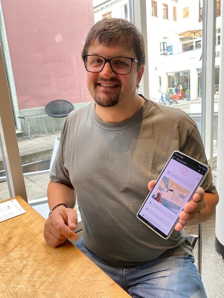 Linard Martinelli, il promotur regiunal da la Lia Rumantscha, muossa ingio chi’s riva grazcha al nouv leporello multimedial (fotografia: Flurin Andry).