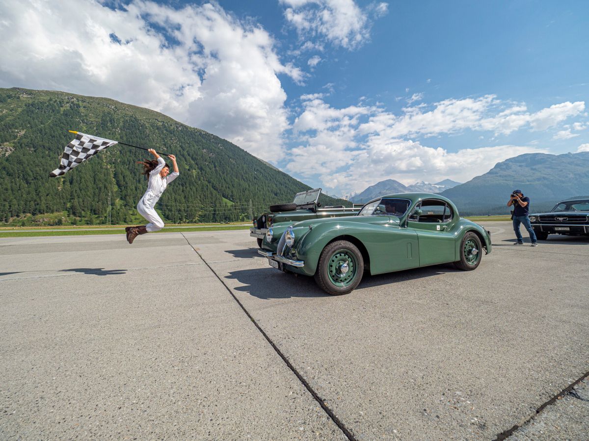 Probelauf für das Beschleunigungsrennen Kilomètre Lancé auf dem Flugplatz in Samedan. Das Starter-Girl schickt einen Jaguar Xk 120 Baujahr 1947 auf die Strecke.