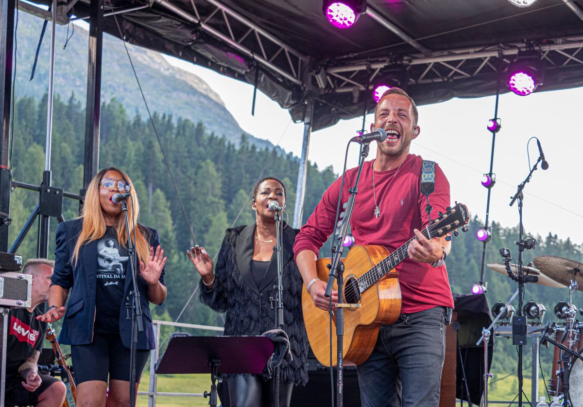 Ihm jedenfalls hat die fantastische Kulisse in der Engadiner Abendsonne ein Lachen ins Gesicht gezaubert, aber nicht die Stimme verschlagen. Im Gegenteil, der 38-Jährige legte mit seiner Band gleich leidenschaftlich los. Mit seiner souligen Stimme gab er sich nahbar, charmant und locker. Immer den Kontakt zum Publikum suchend, konnte er seine Vergangenheit als Strassenmusiker nicht verleugnen.