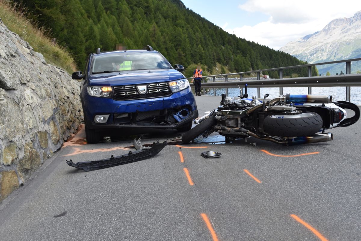 Am Samstag um 14.10 Uhr fuhr eine 54-jährige Motorradlenkerin als Letze einer Motorradgruppe von Maloja herkommend über die Kantonsstrasse H3 in Richtung Silvaplana. Höhe Plaun de Lej kam die Töfffahrerin in einer leichten Linkskurve aus noch nicht geklärten Gründen zu Fall und rutschte folglich auf den linken Fahrbahnstreifen in ein korrekt entgegenkommendes Fahrzeug. Durch die Kollision zog sich die Frau Beinverletzungen zu. Ein Ambulanzteam der Rettung Oberengadin versorgte die Patientin vor Ort notfallmedizinisch und überführte sie anschliessend ins Spital Samedan. An beiden Fahrzeugen entstand erheblicher Sachschaden und wurden abgeschleppt. Für die Unfallaufnahme wurde die Kantonsstrasse H3 für rund eine halbe Stunde für jeglichen Verkehr gesperrt. Die Kantonspolizei Graubünden klärt die Unfallursache sowie den genauen Unfallhergang ab.