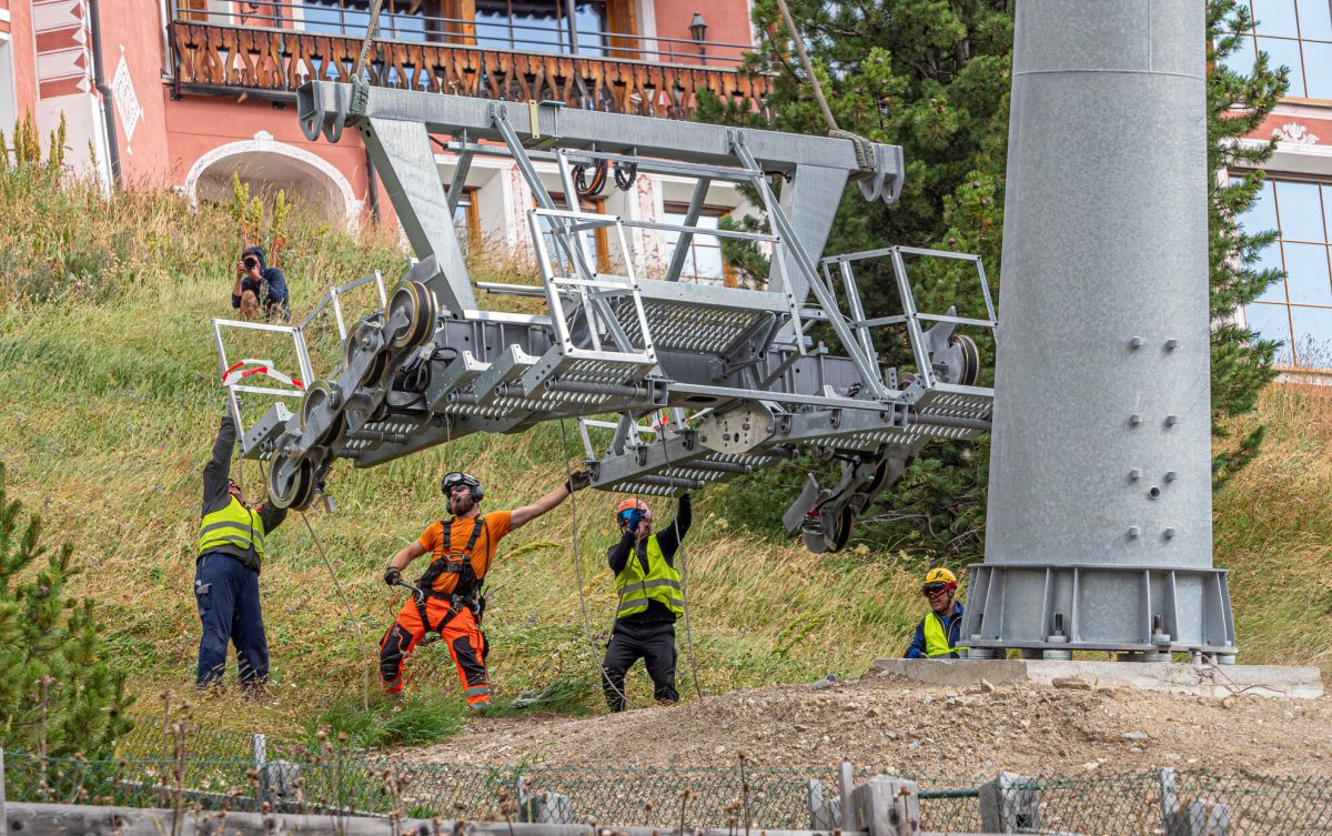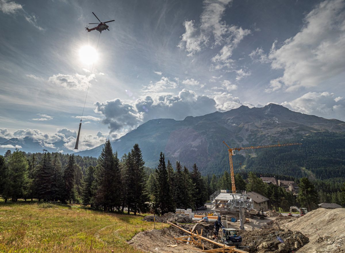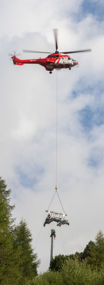 Es ist ruhig an diesem Mittwochmorgen kurz nach 7.00 Uhr bei der Talstation Suvretta. Zwei Bauarbeiter trudeln gemütlich ein und bereiten die Baustelle für die Tagesarbeiten vor. Da knattert es am Himmel, erst leise, dann immer lauter. Vom Julierpass herkommend quert ein eindrücklich grosser Hubschrauber den Suvretta-Hang und verschwindet hinter den Bäumen Richtung Salastrains. Eine knappe halbe Stunde später ist es mit der Ruhe endgültig vorbei. Ein Super Puma der Heliswiss International fliegt Richtung Randolins. An einer 50 Meter langen Leine hängt am Hubschrauber ein grosses zylindrisches Stahlrohr. Es handelt sich um die erste von sieben Stützen für die neue Sesselbahn. Am Boden bei der vorbereiteten Plattform wartet ein Trupp-Arbeiter. Jetzt muss es schnell gehen, der Einsatz eines Super Pumas mit Besatzung zahlt sich nicht aus der Portokasse. Da zählt jede Minute.