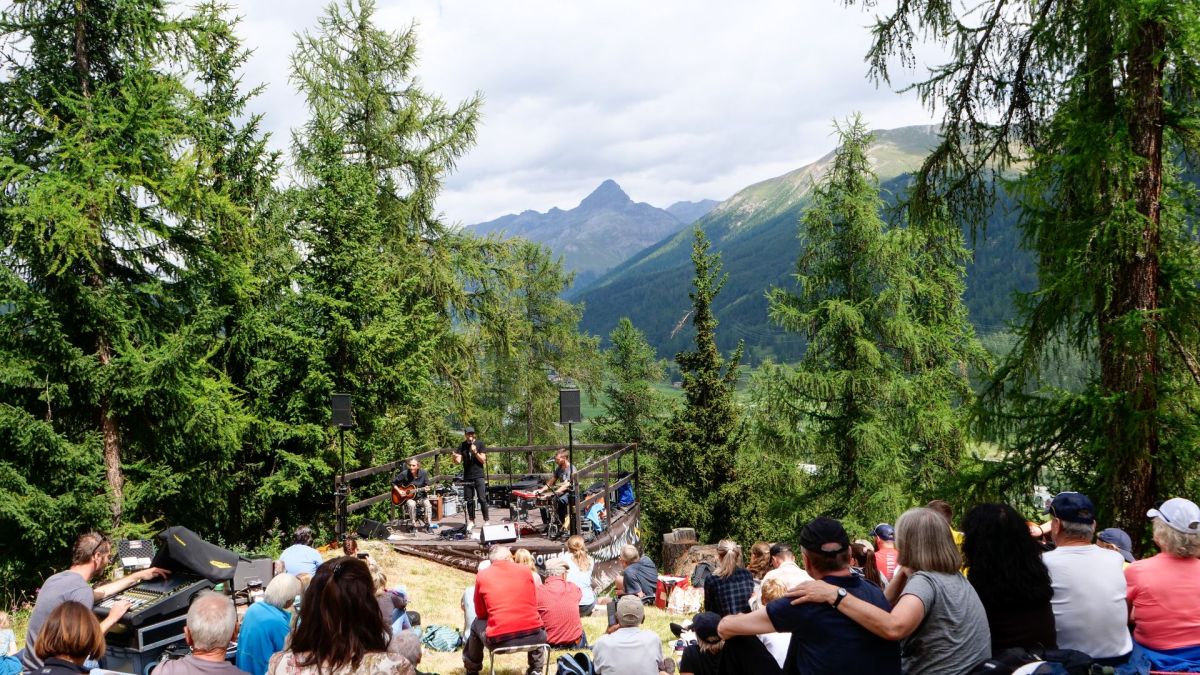 Das Ritschi-Trio auf der kleinen Guardaval-Bühne vor imposanter Kulisse. Foto: Jon Duschletta