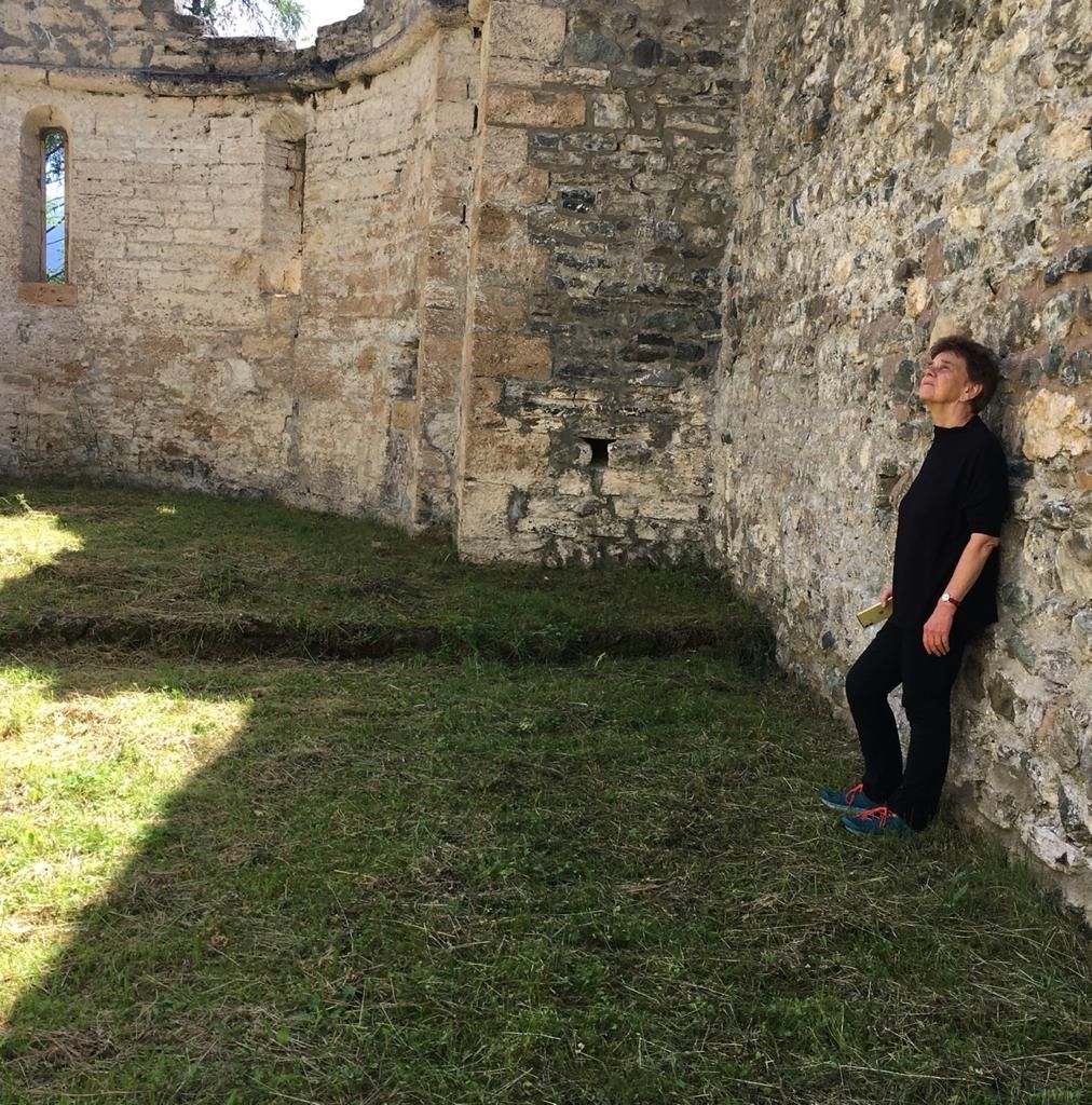 Angelika Overath illa ruina da la baselgia San Peder (fotografia: Claudia Demel).