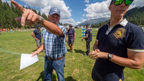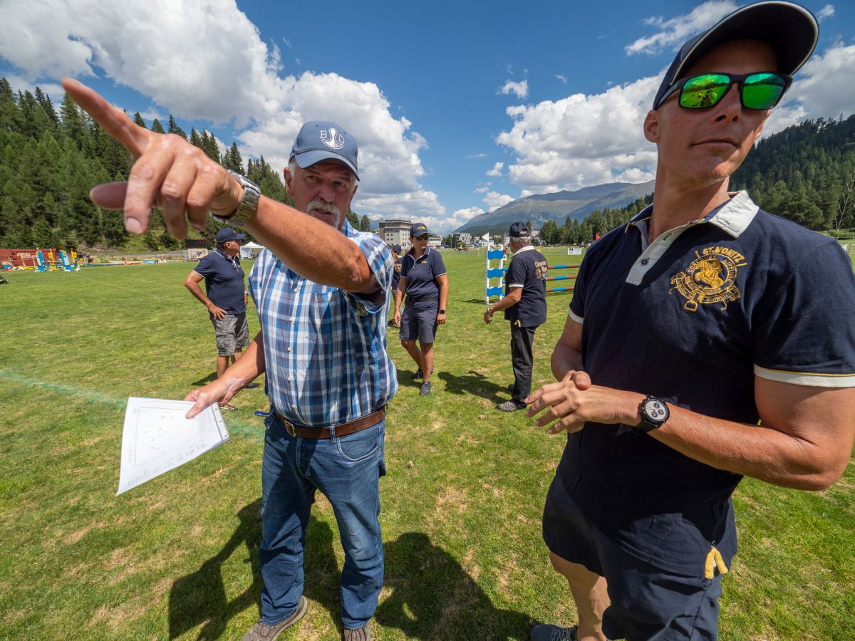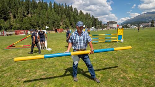 «Den Oxer stellen wir drei Meter nach hinten, und die Tripple-Barre kommt zehn Meter weiter nach links.» Es bleiben noch 25 Minuten bis zum Start des Preises Engadiner Post, und Parcours-Bauer Edi Hofmann instruiert, nicht hektisch, aber bestimmt, mitten auf der grossen Polowiese in St. Moritz seinen Helfertrupp. An seinem Gürtel hängt der vorher am Computer ausgetüftelte Plan des vierten Parcours am Starttag des Concours Hippique.