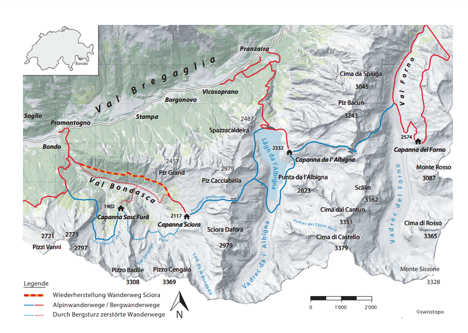 Der Bergsturz von Bondo hatte auch fatale Folgen für die beiden SAC-Hütten Sciora zuhinterst im Tal auf 2118 Metern über Meer gelegen, und Sasc Furä, welche sich etwas weiter vorne in der Val Bondasca auf 1904 Metern über ...