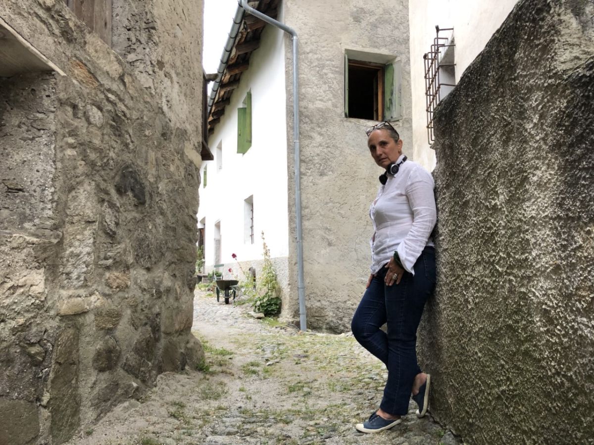 Patrizia Guggenheim in der Gassa Varlin in Bondo. Der Murgang blieb nur zwanzig Meter vor ihrem Wohnhaus stehen. Foto: Marie-Claire Jur