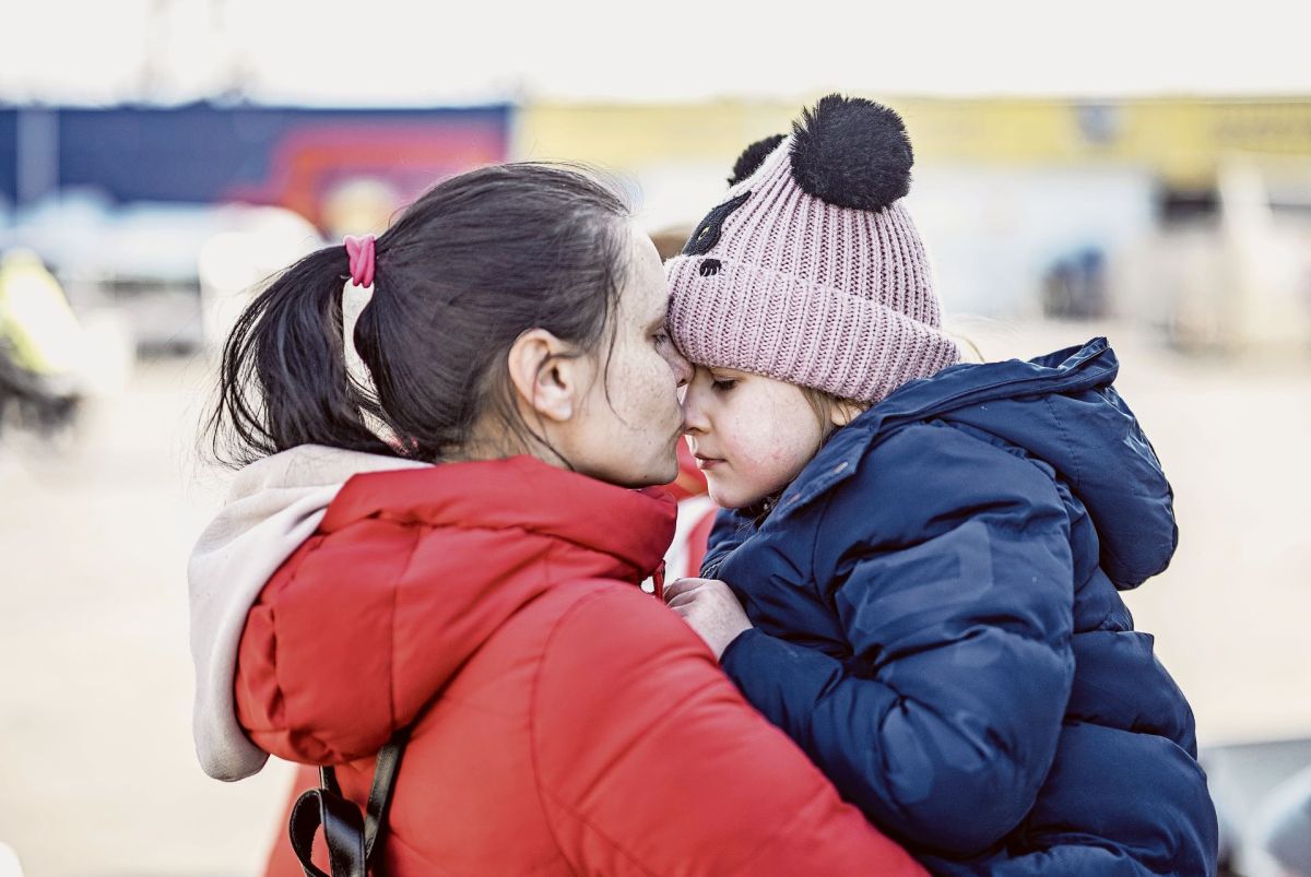 Eine Mutter mit ihrem Kind, aufgenommen im ukrainischen Grenzgebiet, kurz vor der Abreise in die Schweiz. Foto: Mayk Wendt