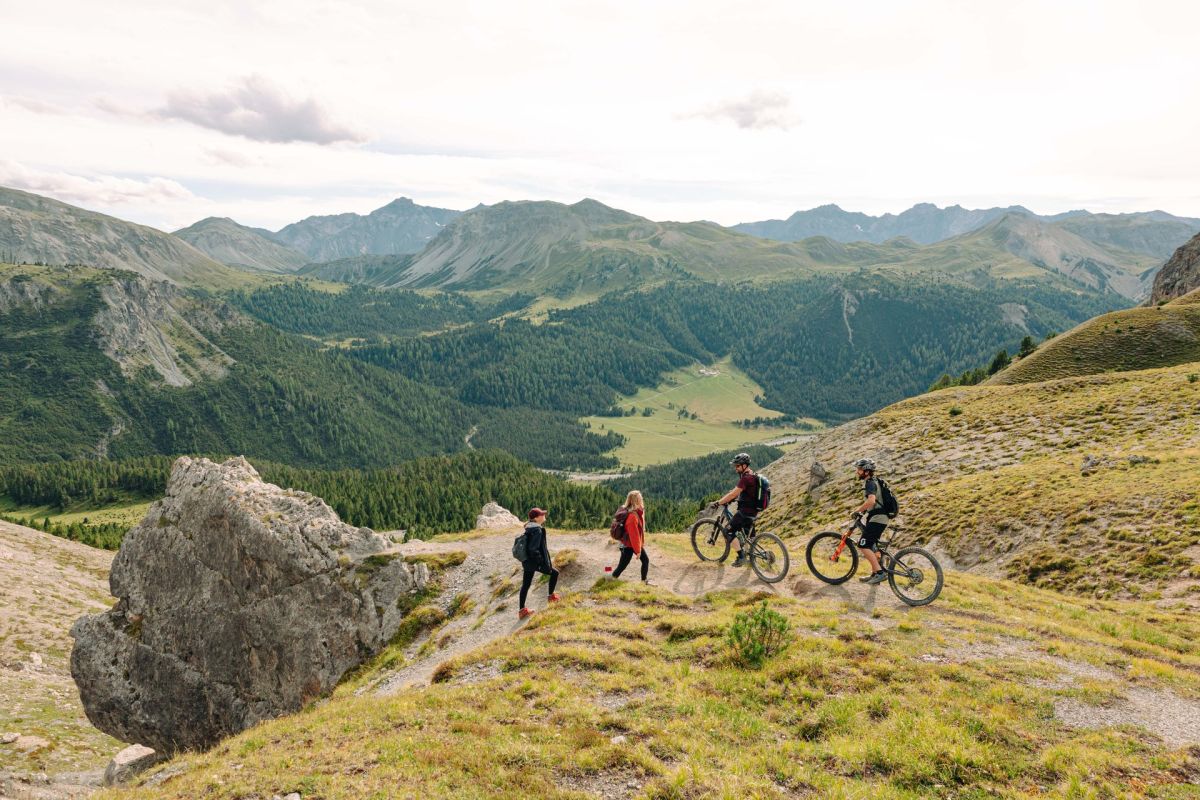 Viandants e bikers i’l Parc da natüra Biosfera Val Müstair chi piglian resguard l’ün a l’oter (fotografia: Doyenne).