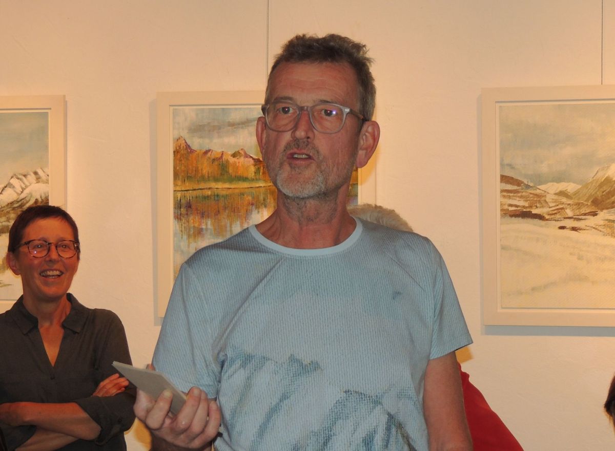 L’artist inglais Peter Brimelow expuona 25 purtrets illa Grotta da cultura a Sent chi muossan la cuntrada muntagnarda in Engiadina Bassa fotografia: Benedict Stecher).