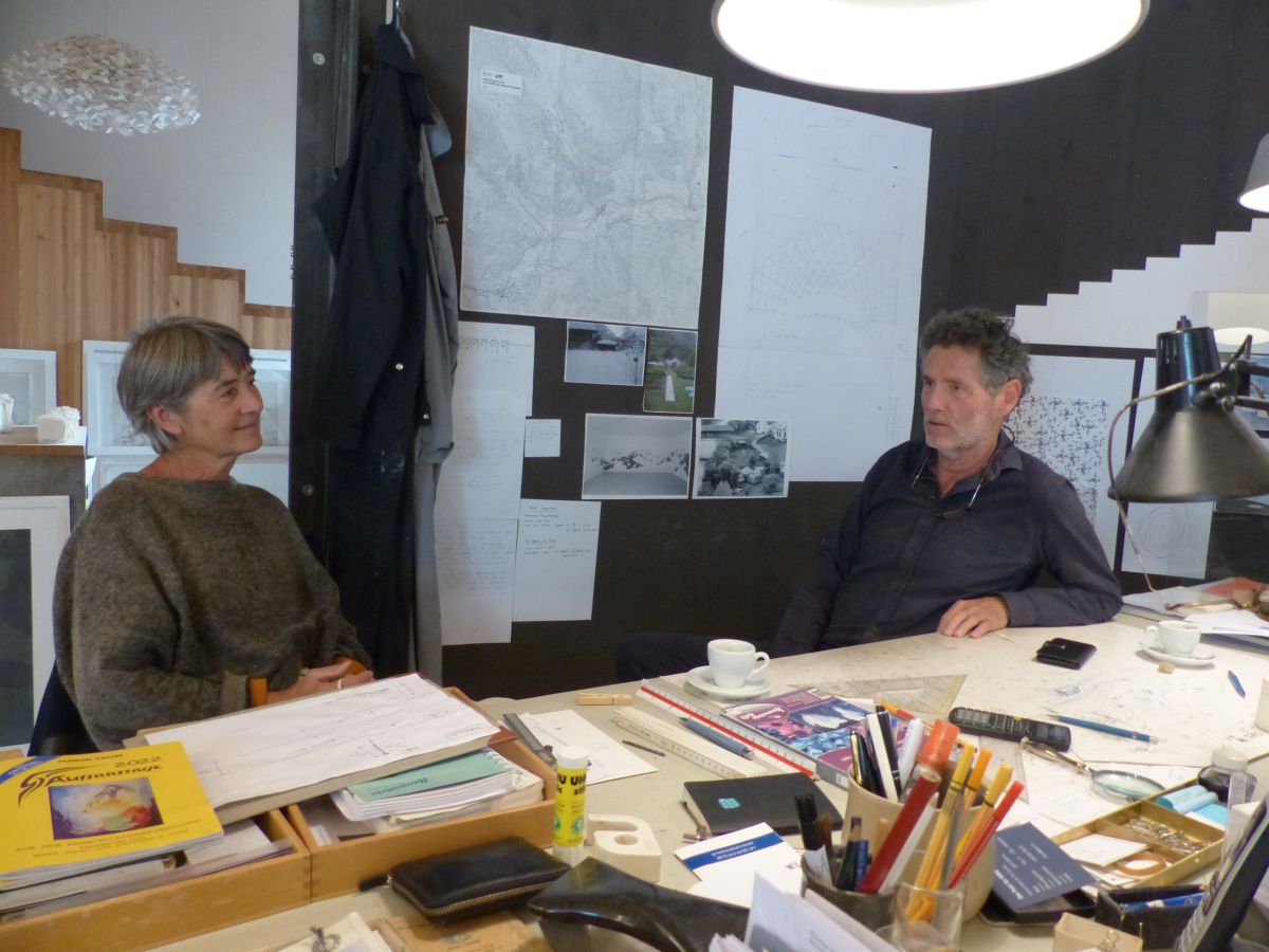 Madlaina Lys e Flurin Bischoff vi da la gronda maisa in l’atelier (fotogafia: Flurin Andry).