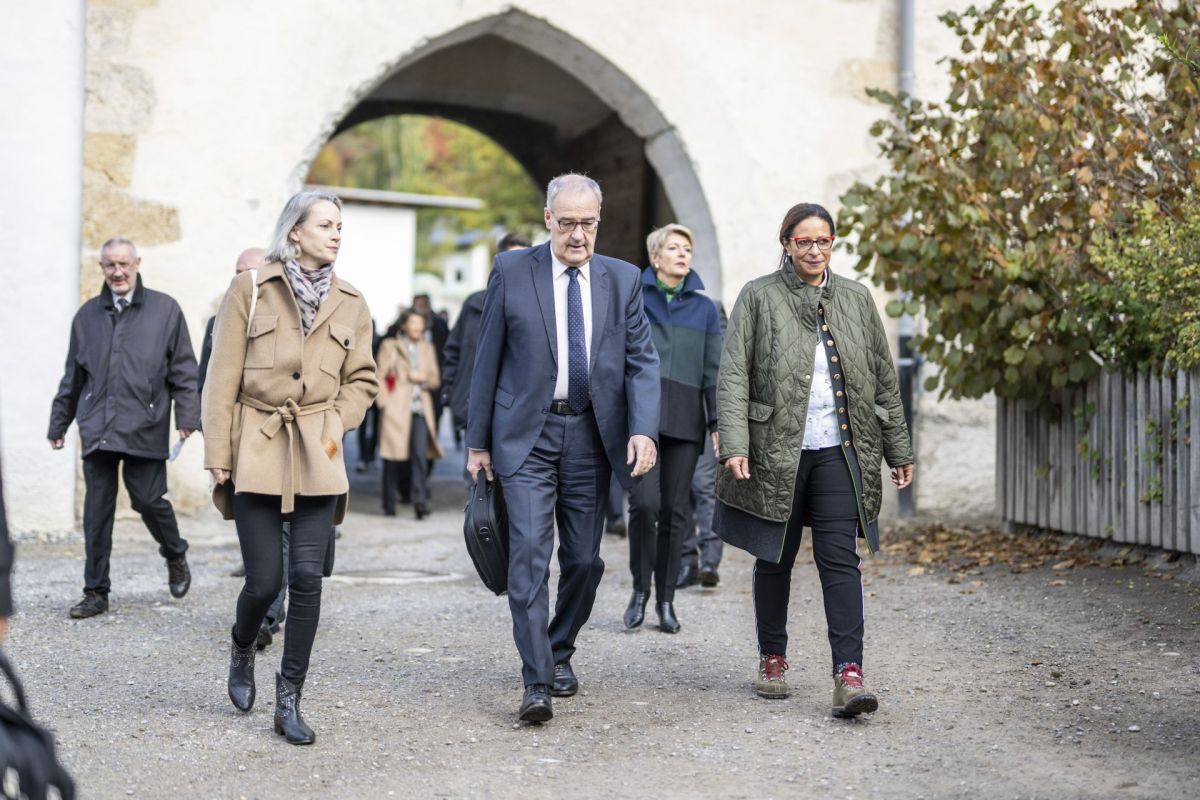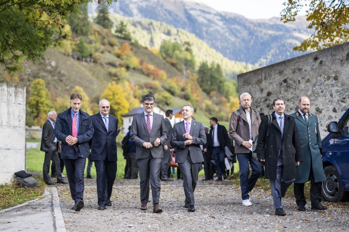 I d’eira üna bunura sco üsità in marcurdi passà a Müstair, ma vers ün quart avant las nouv es la quietezza quotidiana gnüda interruotta dal fracasch d’ün elicopter. In seguit s’han plachats duos ulteriurs elicopters e’ls cusgliers federals – cumprais delegaziun – s’han miss in viadi in direcziun da la Clostra San Jon per la tschantada «extra muros». Be Simonetta Sommaruga es fingià rivada cul bus la saira avant ed ella ha spettà a seis collegas davant l’entrada da la clostra. Davo cha la presidenta cumünala da Val Müstair, Gabriella Binkert Becchetti, es ida a bivgnantar a la Regenza svizra sülla prada davo la clostra, sun tuots its illa müraglia istorica da San Jon per l’inscunter ourdvart ils mürs da la Chasa federala.