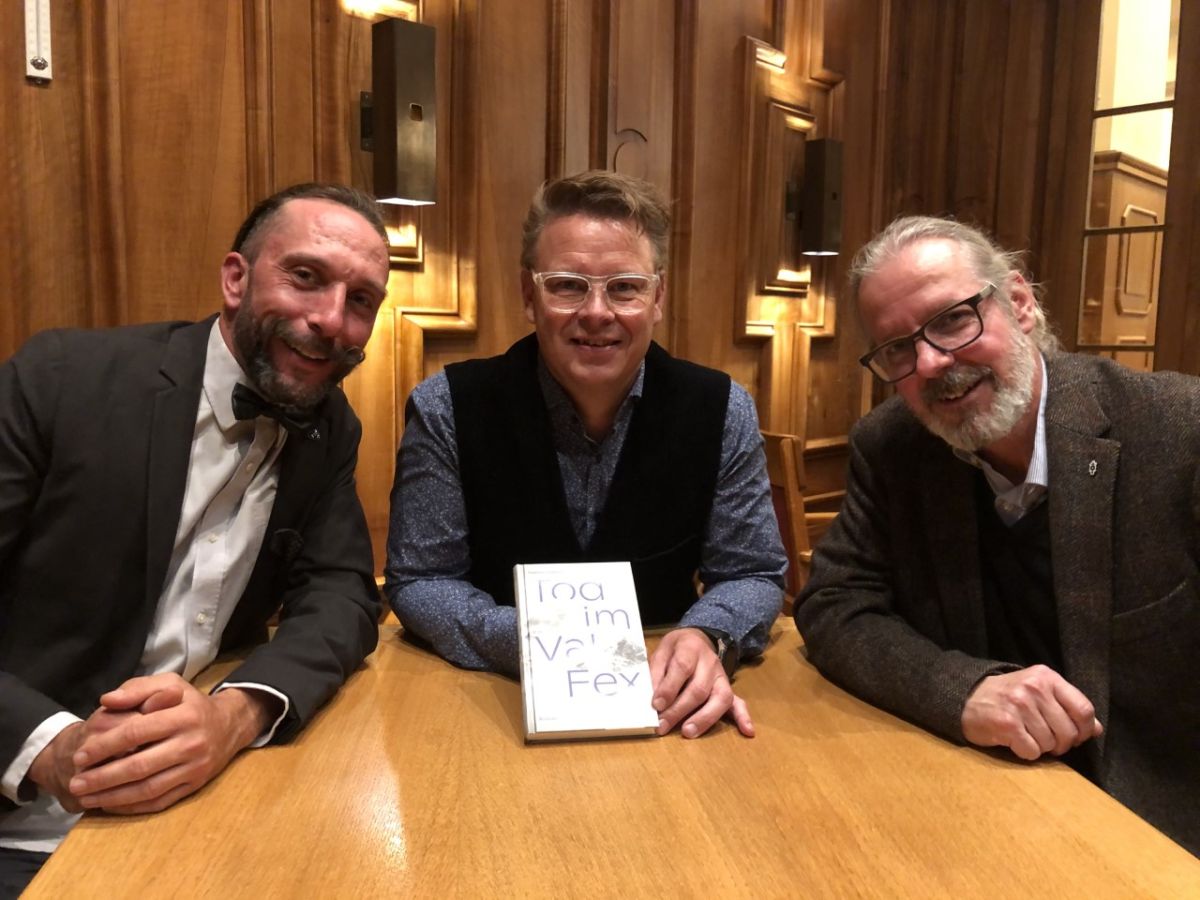 Der Autor Andrea Gutgsell (in der Bildmitte), flankiert von seinem Lektor Thomas Gierl (rechts), und Schauspieler Lorenzo Polin anlässlich der Buchvernissage im Silser Hotel Waldhaus. Foto: Marie-Claire Jur