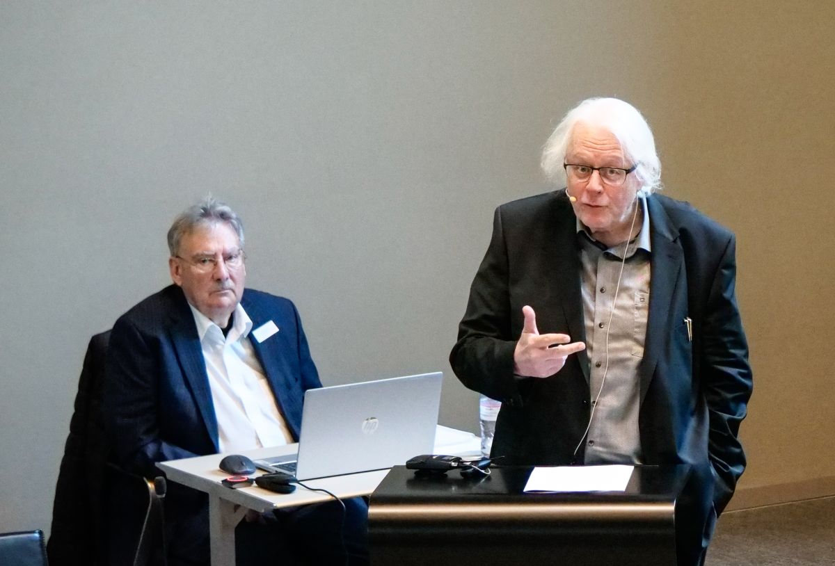 SP-Urgestein Peter Bodenmann während seinen Ausführungen in Chur. Links der Sekretär der IG Kleingemeinden GR, Alex Brembilla. Foto: Jon Duschletta