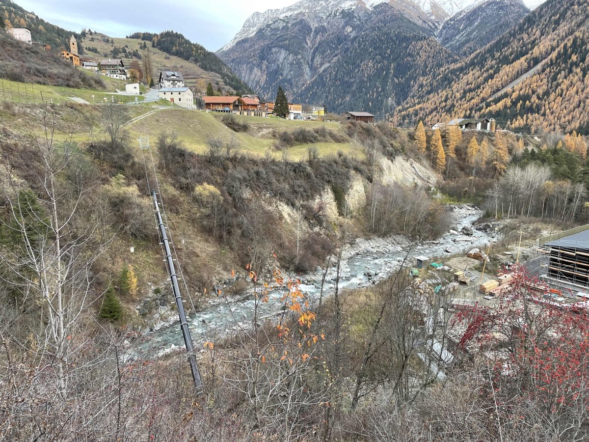 Auf dem Bild ist die Örtlichkeit zu sehen, wo der Mann gefunden werden konnte. Man sieht den Bach Brancla, Wiesland, Bäume, einige Häuser von Ramosch und die Bergwelt (Foto: Kantonspolizei Graubünden).
