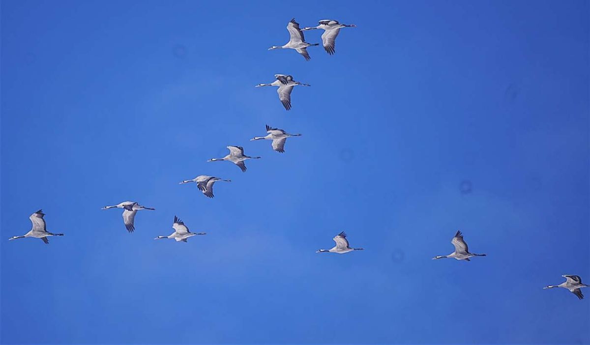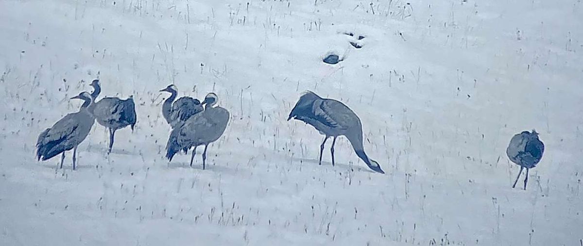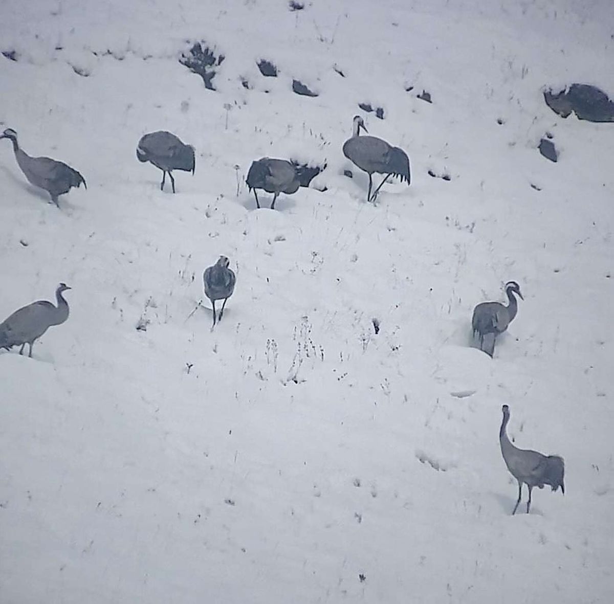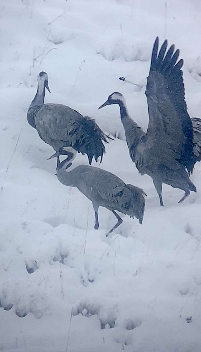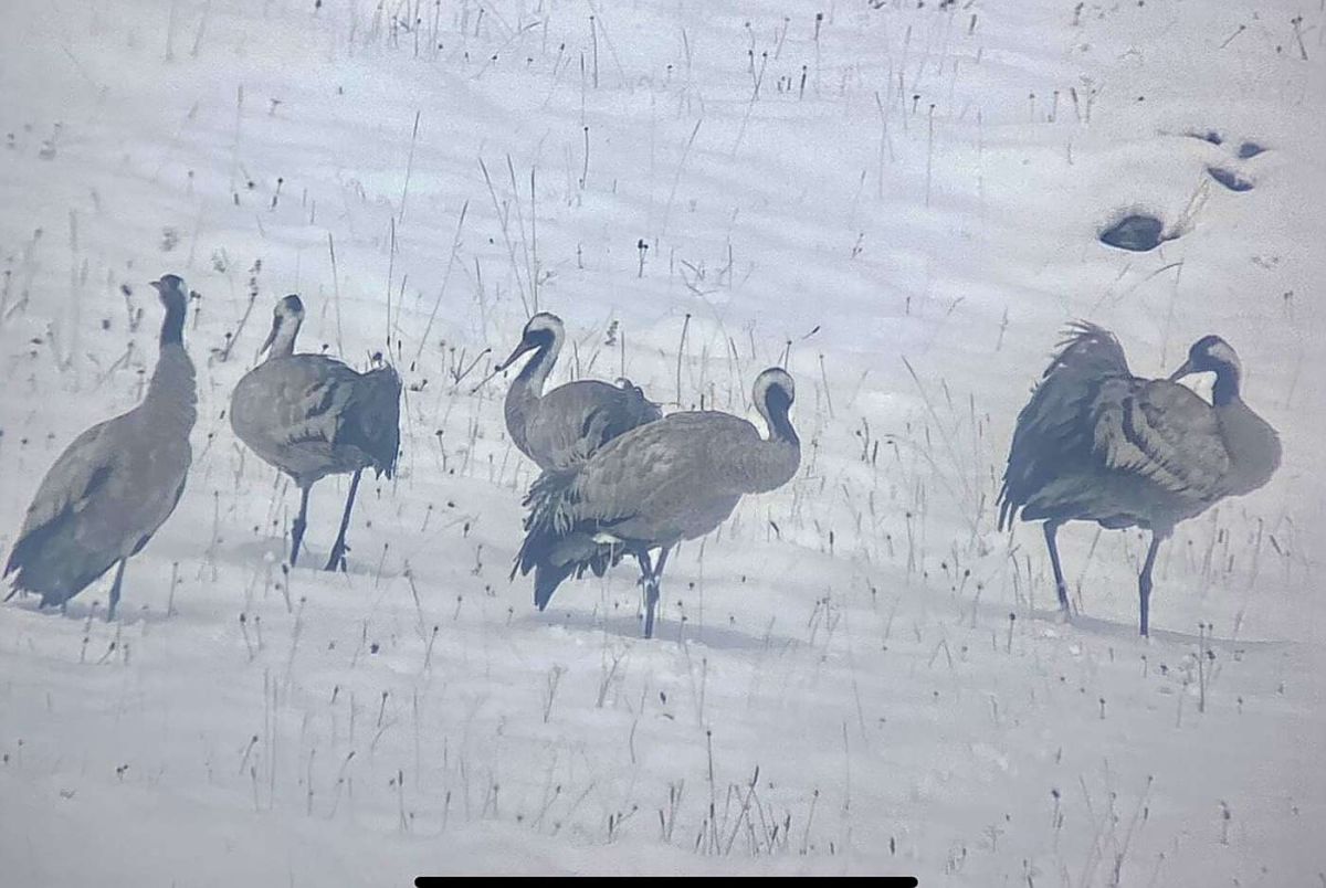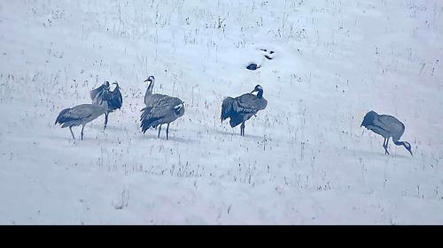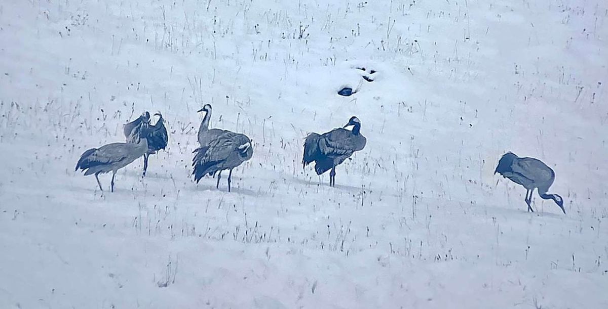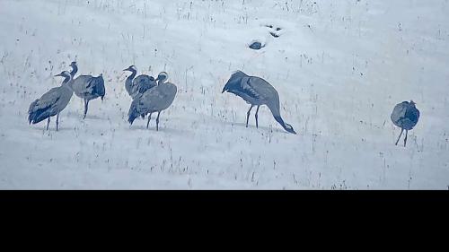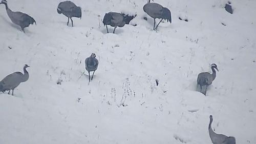 Im Neuschnee stocherten sie mit ihren langen Schnäbeln und bewegten sich langsam zu Fuss hangaufwärts. Kurz nach Mittag, als sich die letzten Wolken auflösten, reckten die Kraniche synchron ihre Hälse, als wollten sie ihre Bereitschaft zum Abflug signalisieren.