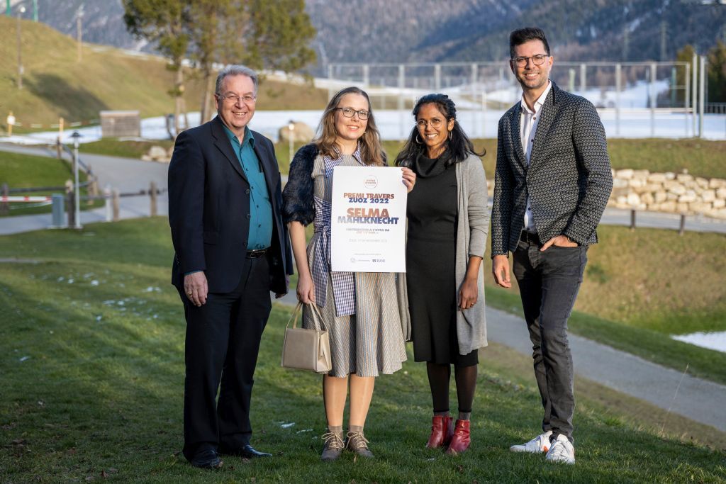 La surdeda dal prüm «Premi Travers Zuoz» cun (da schnestra) Lucian Schucan (vschinauncha da Zuoz), Selma Mahlknecht (autura), Gianna Olinda Cadonau (organisatura) e Rico Valär (giuria) (fotografia: Mayk Wendt).