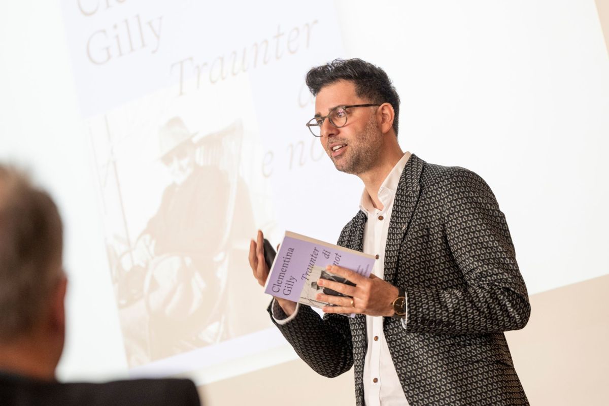 Il romanist Rico Valär düraunt la preschantaziun dal cudesch da Clementina Gilly (fotografia: Mayk Wendt).