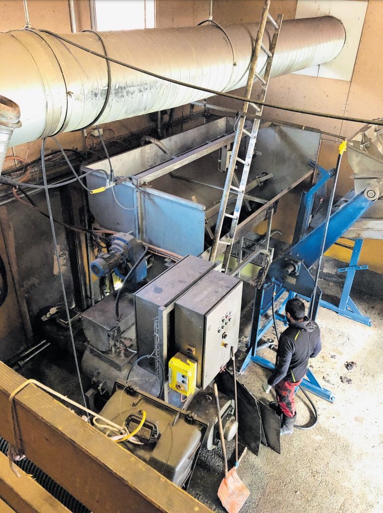 Die Kippmulde (rechts in blau) entleert die Kübel mit den Speiseresten in die Hammermühle (Bildmitte), wo sie zerkleinert werden. Darunter werden die zerkleinerten Speisereste in einer Wanne aufgefangen und anschliessend in die Kocher gepumpt.