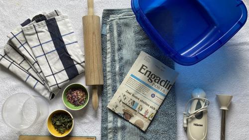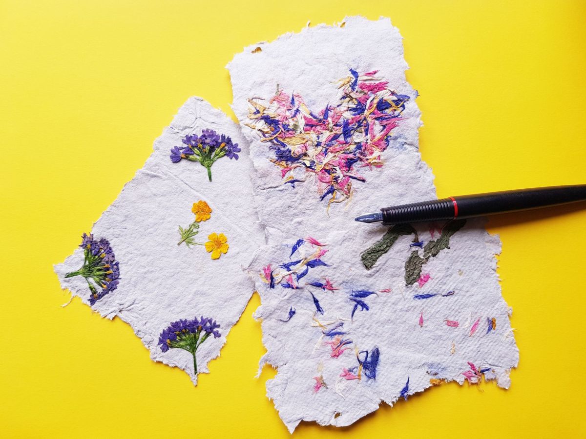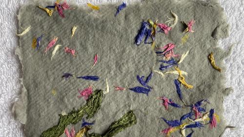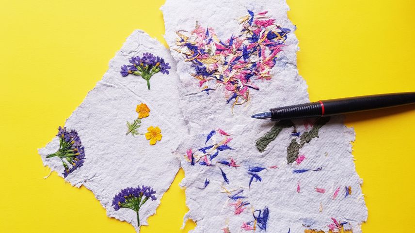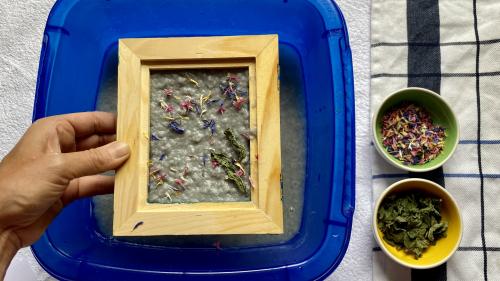 6. Wenn du dein Papier verzieren möchtest, ist jetzt der richtige Moment: Lege zum Beispiel gepresste Blüten oder alte Kräuter auf die abgeschöpfte Pulpe im Schöpfrahmen.