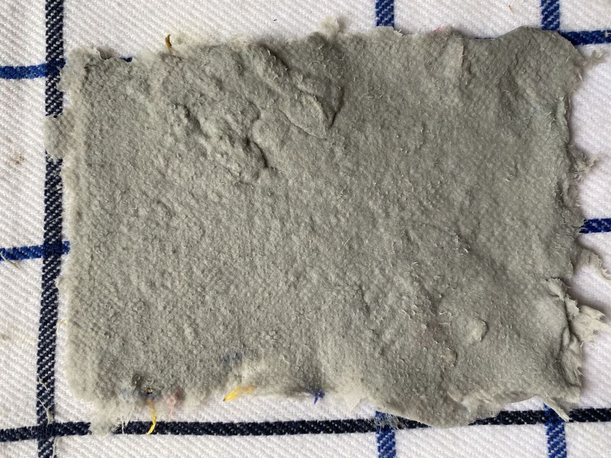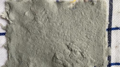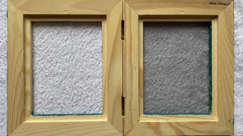 8. Tupfe nun mit einem weiteren Tuch die Oberfläche des Netzes ab, sodass möglichst viel Wasser aufgesogen wird. Hebe dann vorsichtig den Schöpfrahmen an und löse ihn vom Papier. Wenn das Papier am Schöpfrahmen klebt, kannst du vorsichtig mit den Fingern oder einem Messer nachhelfen oder durch das Netz auf das Papier pusten.