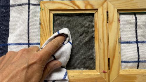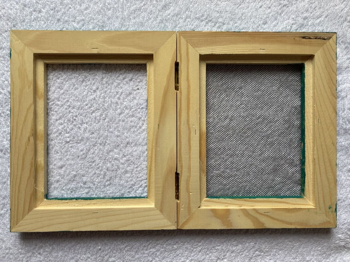 Schöpfrahmen gibt es zwar zu kaufen, nachhaltiger ist es aber, wenn du den Rahmen einfach selber machst. Am einfachsten geht das, indem du einen alten Holzbilderrahmen verwendest und ein feines Netz darüber spannst. Als Netz eignen sich zum Beispiel Reste eines Fliegengitters, eine alte Stumpfhose oder ein anderes feine Netz. Nimm die obere Hälfte des Bilderrahmens ab und befestige das Netz auf die Innenseite der unteren Hälfte, sodass es zwischen dem Bilderrahmen eingespannt ist.