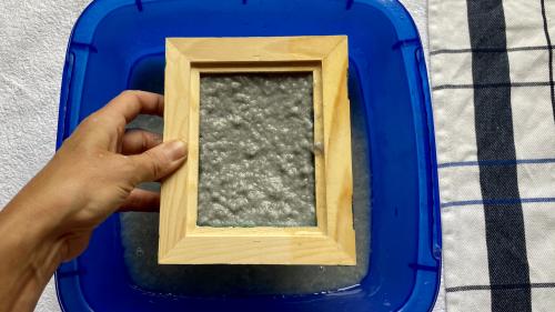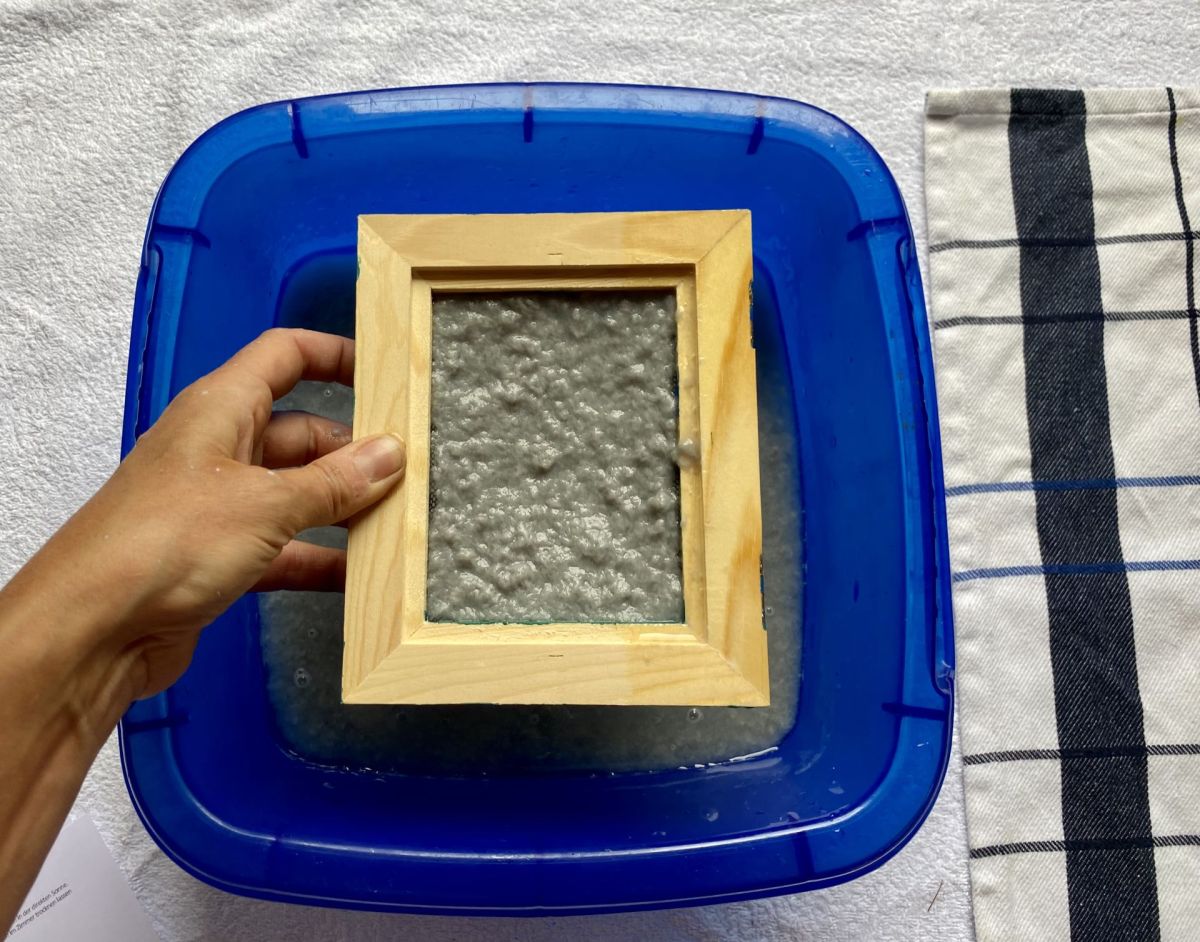 5. Tauche den Schöpfrahmen in das Becken und führe ihn langsam waagerecht wieder heraus. Lasse das Wasser gut abtropfen.