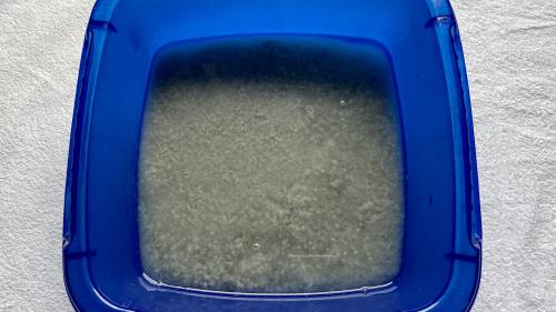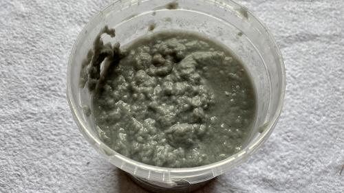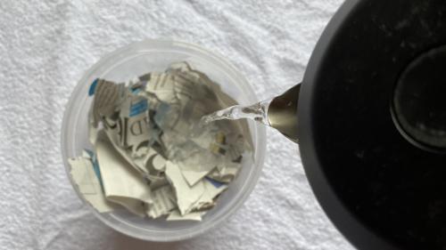 2. Püriere die Pulpe mit dem Pürierstab bis ein dicker Brei entsteht und keine Papierschnipsel mehr zu sehen sind.