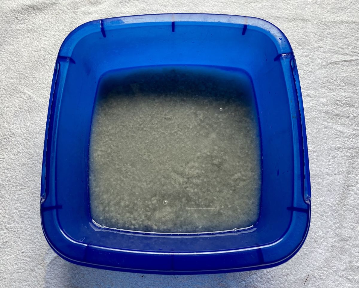 3. Fülle das Becken mit Wasser und mische die Pulpe unter. Je nachdem, wie viel Wasser du in die Wanne gibst, wird das Papier dicker oder dünner. Hier gilt es, einfach auszuprobieren: Wenn dir das Papier zu dünn ist, kannst du etwas Wasser abschöpfen oder mehr Pulpe hinzufügen. Andernfalls fügst du einfach mehr Wasser hinzu.