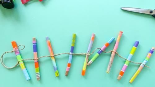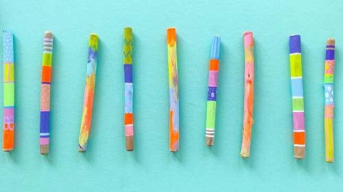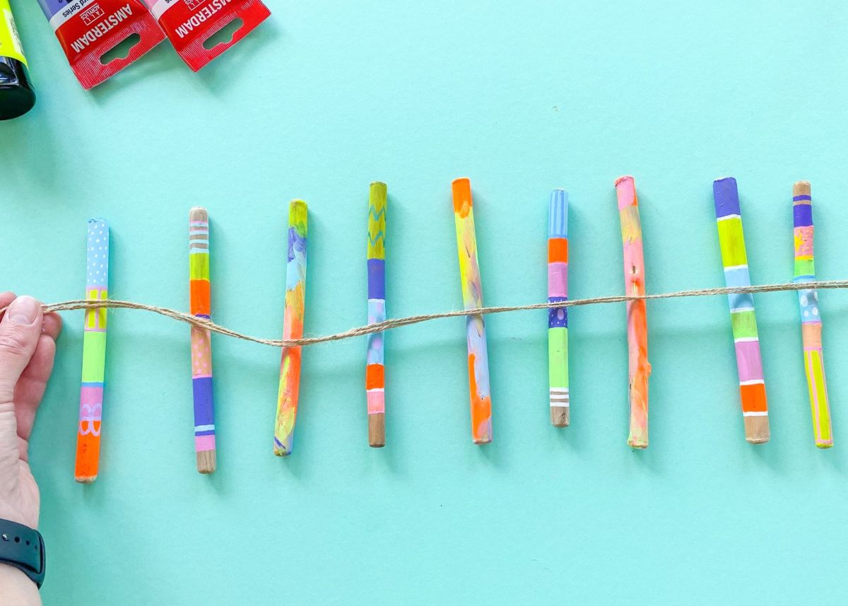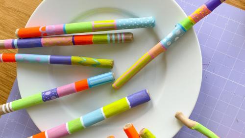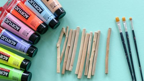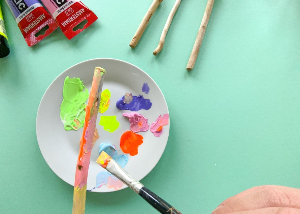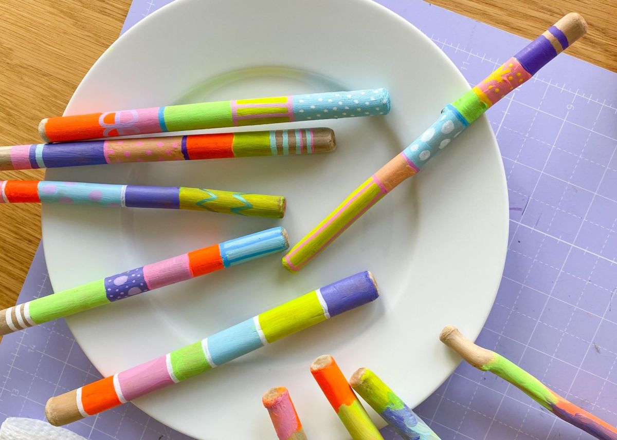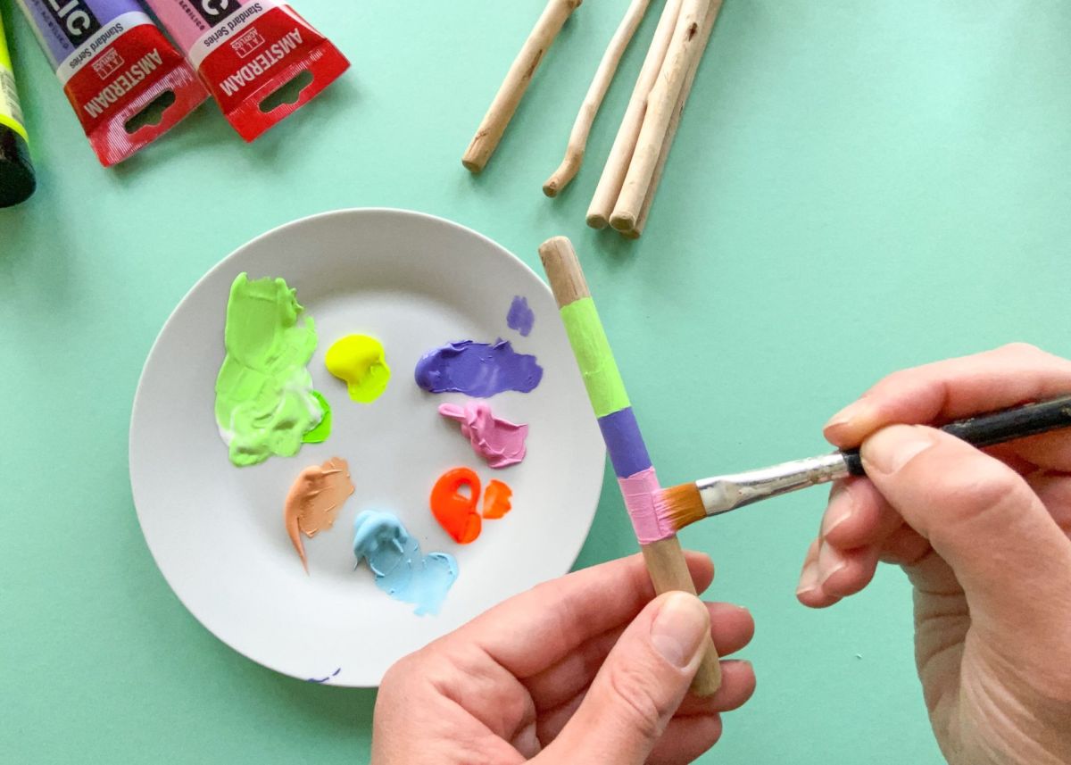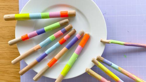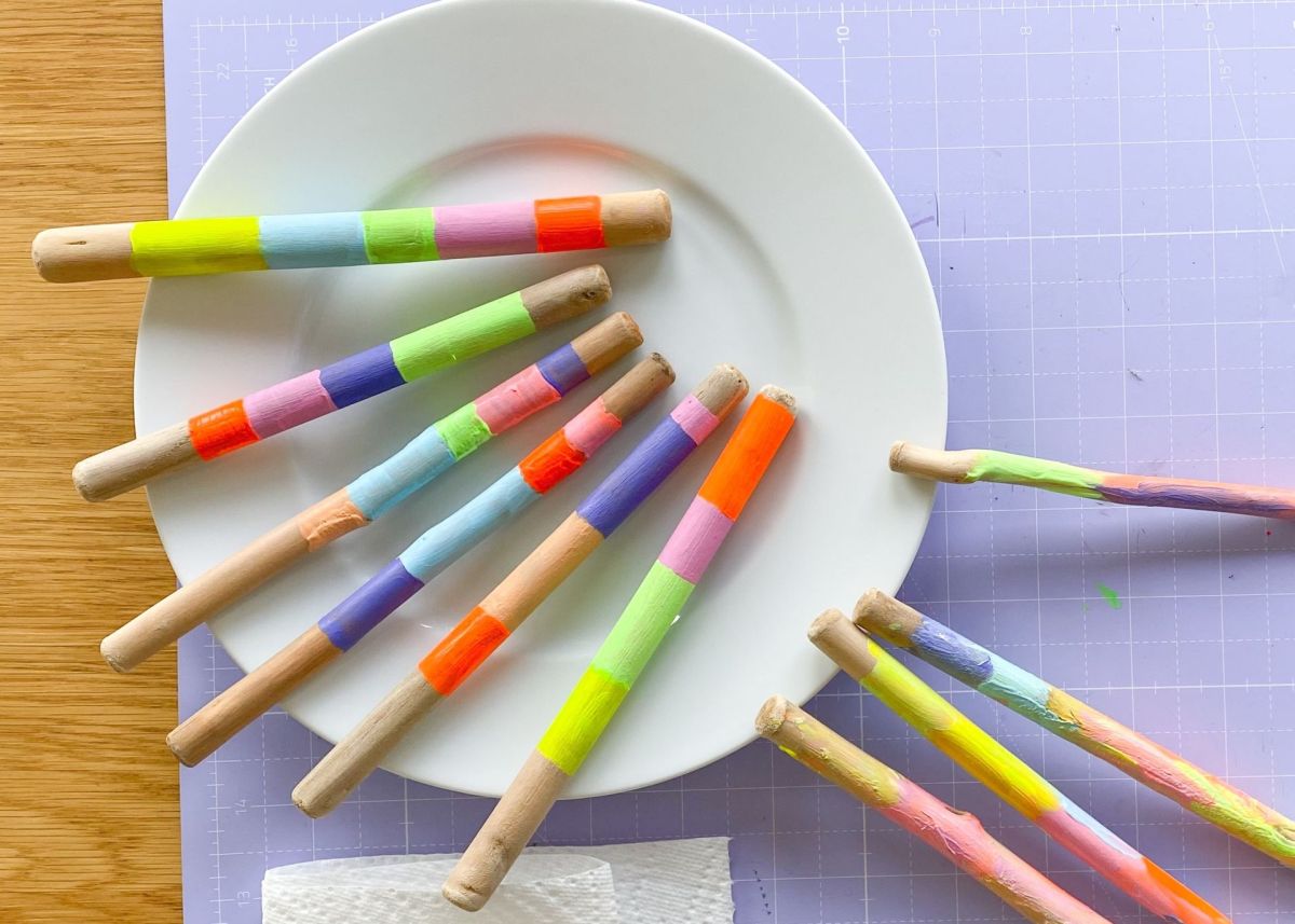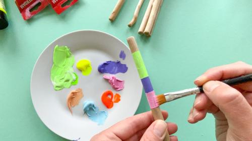 2. Jetzt geht es ans anmalen! Hierzu verwendet ihr Acryl- oder Kreidefarbe, da diese auf Holz super hält und schön deckt. Bemalt die Stöcke nach Lust und Laune: in Streifen, mit Punkten, komplett in einer Farbe, oder ganz bunt vermischt. Legt die Stöcke auf einen Teller, und lasst die Farbe gut trocknen.