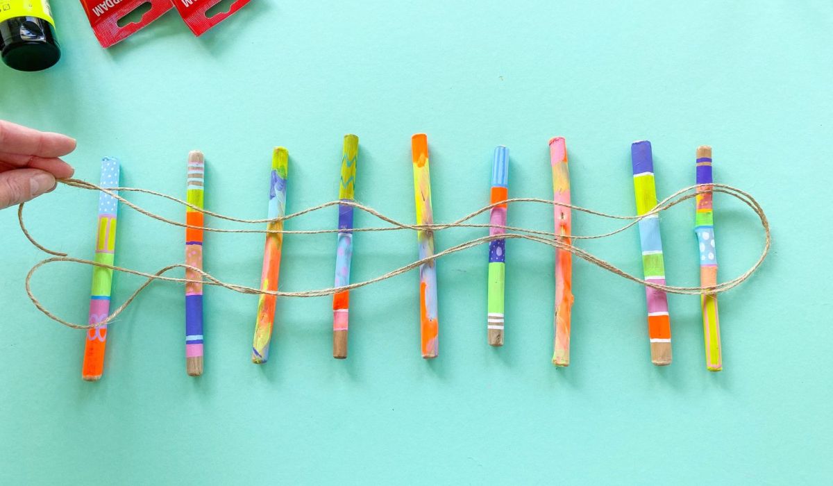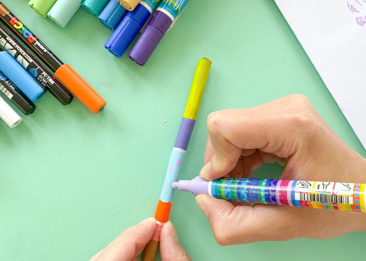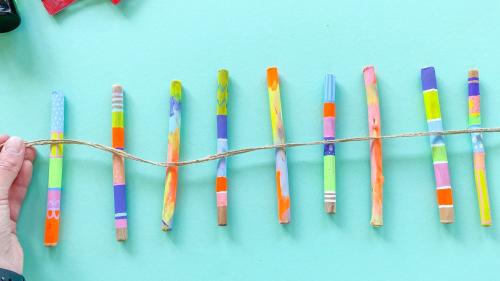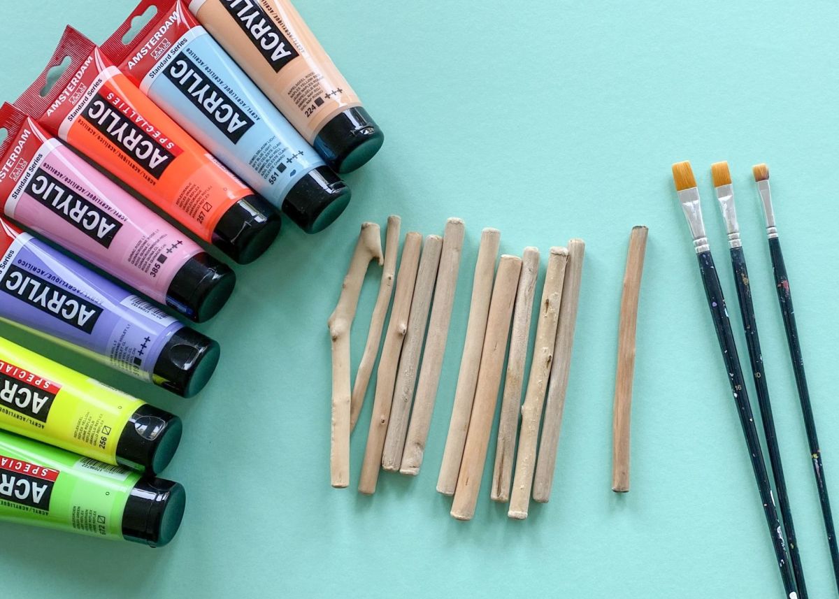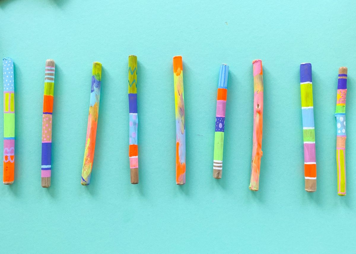 4. Nachdem auch die Farbe der Acrylstifte getrocknet ist, legt ihr die bemalten Stöcke nebeneinander hin und schaut, welche der bemalten Stöcke toll nebeneinander aussehen. Wir haben die gestreiften und die bunt verwischten Stöcke mit entsprechendem Abstand abwechselnd platziert.