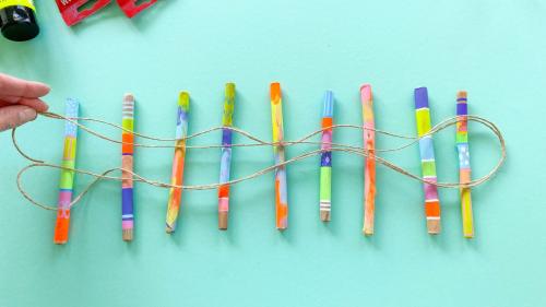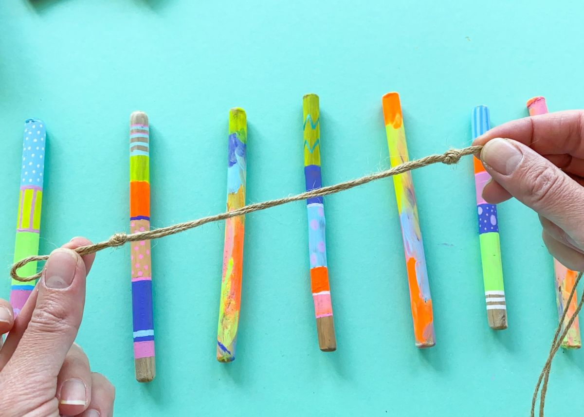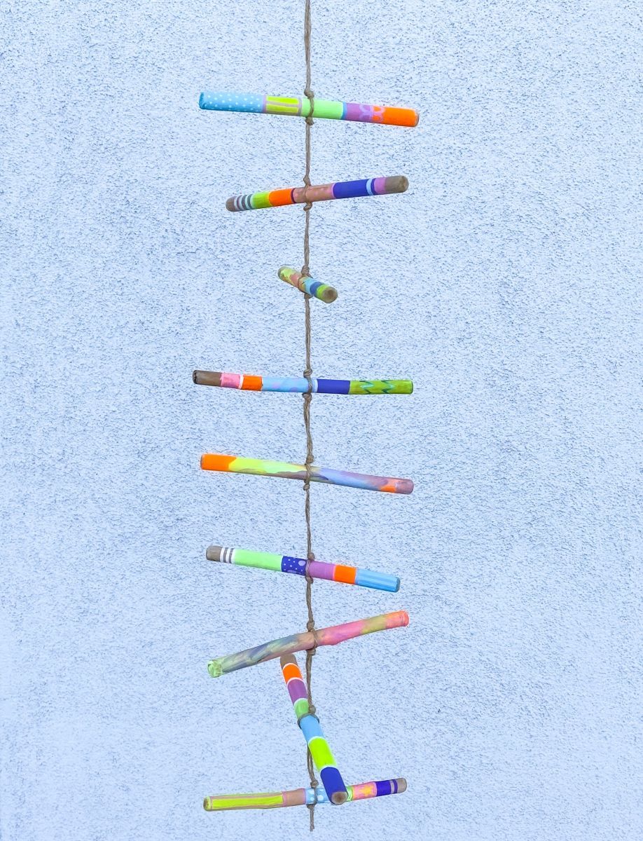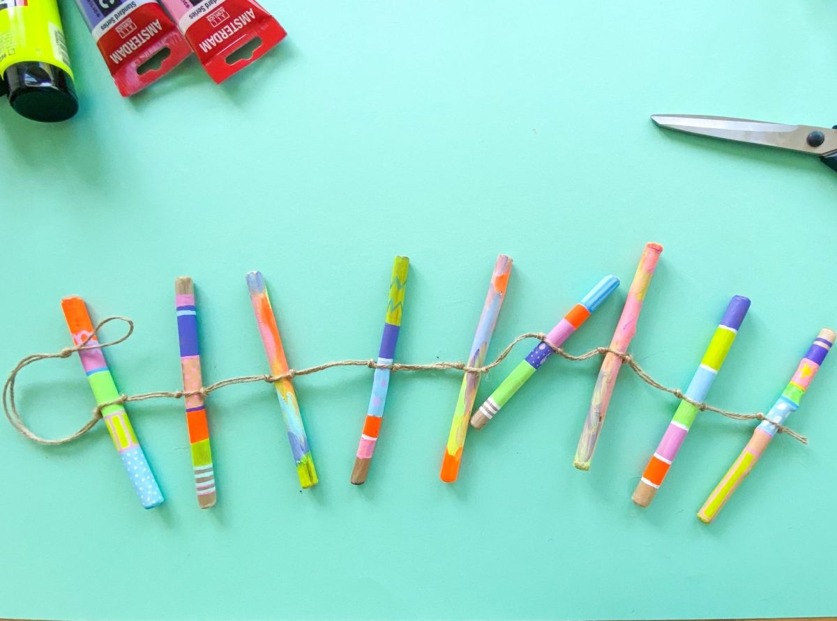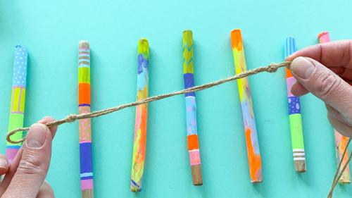 4. Nachdem auch die Farbe der Acrylstifte getrocknet ist, legt ihr die bemalten Stöcke nebeneinander hin und schaut, welche der bemalten Stöcke toll nebeneinander aussehen. Wir haben die gestreiften und die bunt verwischten Stöcke mit entsprechendem Abstand abwechselnd platziert.