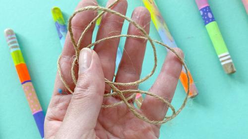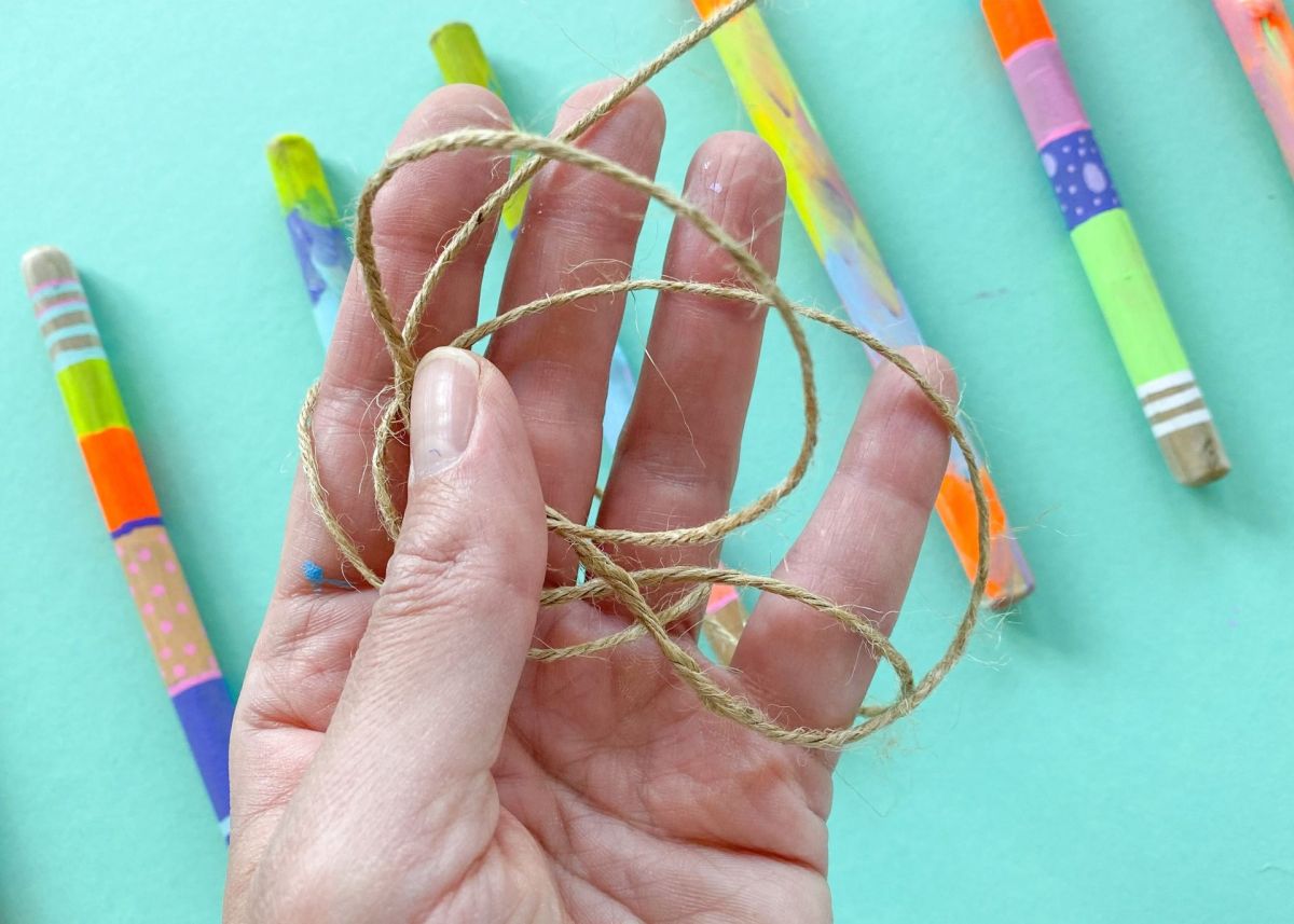 5. Nun nehmt ihr das Jutegarn zur Hand, und legt das Garn doppelt. Legt das Garn einmal über die Länge eurer Stöcke, plus etwas Garn für die Schlaufe zum Aufhängen. Nun nehmt ihr dieses Garn nochmals doppelt, weil ihr einiges an Garn für die Knoten benötigt.