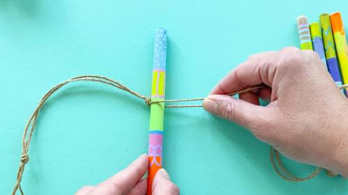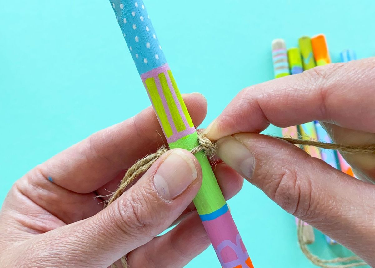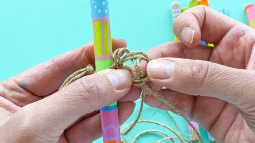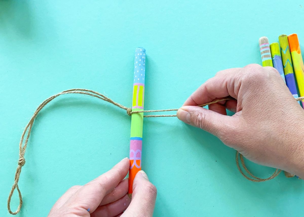 7. Nun legt ihr den ersten Stock ganz eng an diesen Knoten und macht unterhalt des Stocks einen weiteren Knoten. Achtet hierbei darauf den Knoten nicht direkt fest zu ziehen, sondern diesen eher locker zu lassen, damit ihr genug Platz habt, um den Knoten ganz nah an den Stock zu schieben. Je näher der Knoten an dem Stock ist, umso fester sitzt der Stock in eurem Mobilee. Nachdem ihr etwas Freiraum gelassen habt geht ihr so nun weiter fort, bis der letzte Stock befestigt ist. Knoten - Stock - Knoten - Freiraum - Knoten - Stock - Knoten - Freiraum….